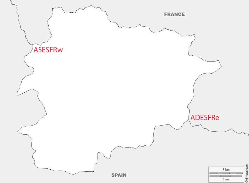 Andorra – French border extends for 63.7 km in southern France (Ariège and Pyrenees-Orientales départements) and northern and north-eastern Andorra. The border’s western extremity starts at the western Andorra–Spain–France tripoint ADESFRw, located at the summit of the Pic de Médécourbe. It then follows a general north-east direction before switching south-eastwards to the eastern Andorra–Spain–France tripoint ADESFRe.