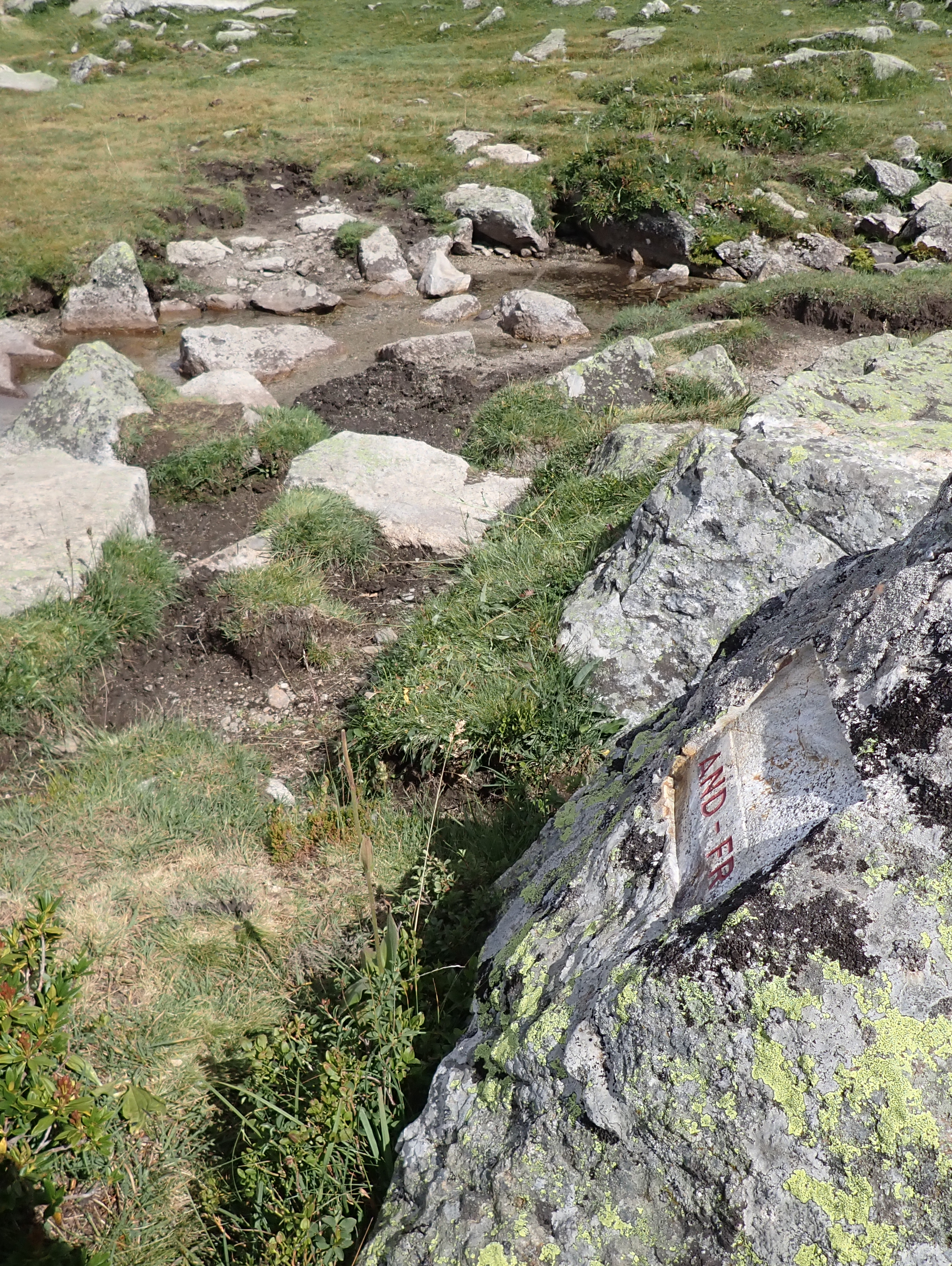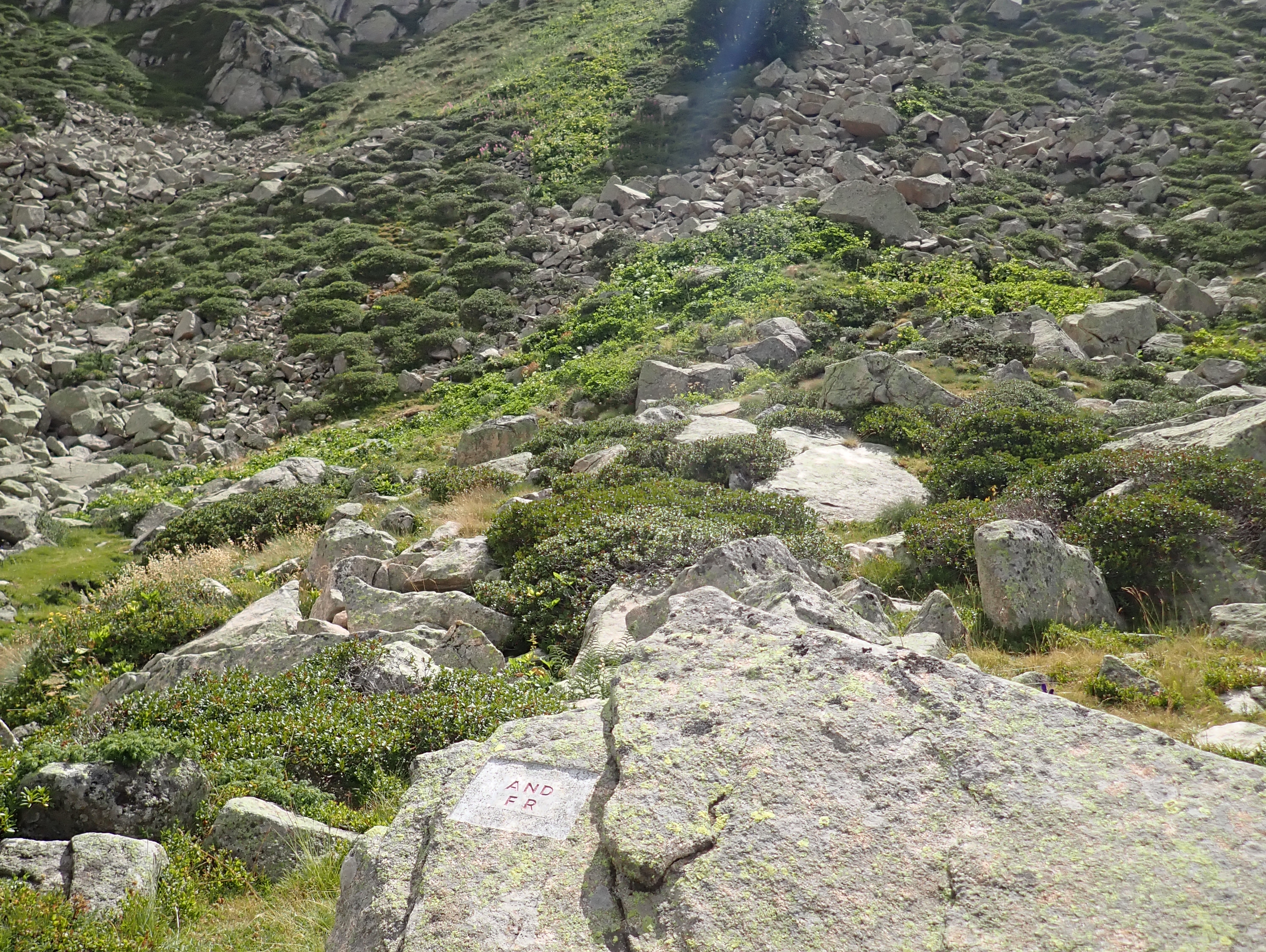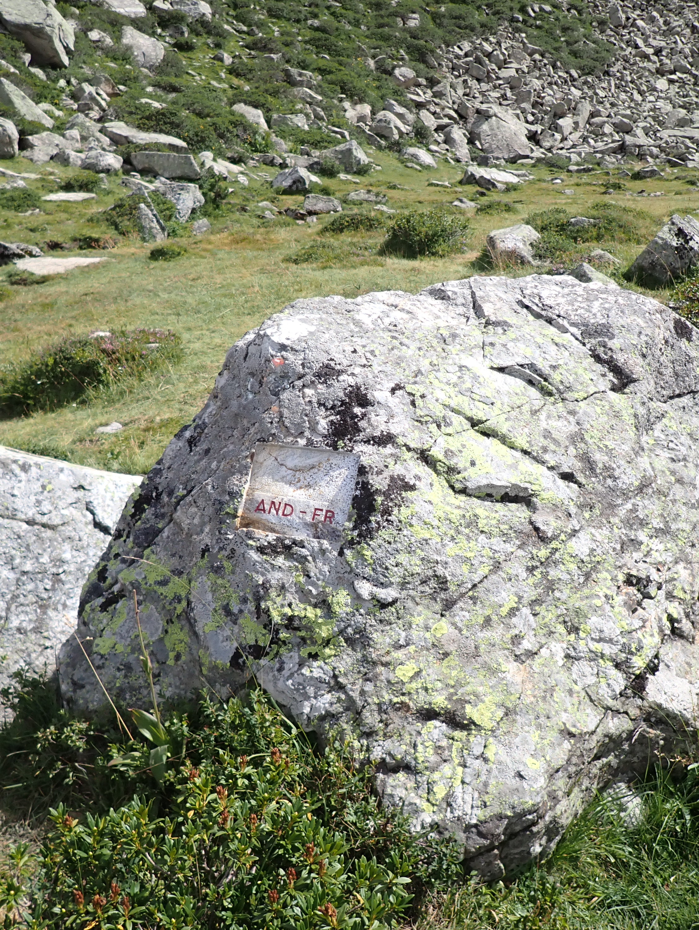 The disputed area was divided approximately in half following the trail from the Coll dels Isards down hill towards (and above) the lake. As the trail was well established it was easy to agree the route. BM#2 and BM#3 are located on the trail (although I was the only one who paid them any notice).