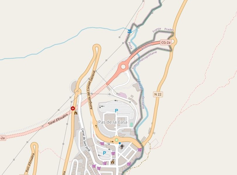 2. The Envalira Tunnel is a tunnel in Andorra that runs between Pas de la Casa near the Andorra-France border and Grau Roig (Ski resort). It enables its users to avoid the Envalira Pass. It is amongst the highest road tunnels in Europe. In 2001, a bilateral treaty between France and Andorra rectified and amended the border slightly. It provided for the exchange of two equal plots of land of 15,925 m² each, to enable Andorra to construct on its assigned plot a viaduct linking the Envalira tunnel to the French RN22. The exact border is marked on the road.