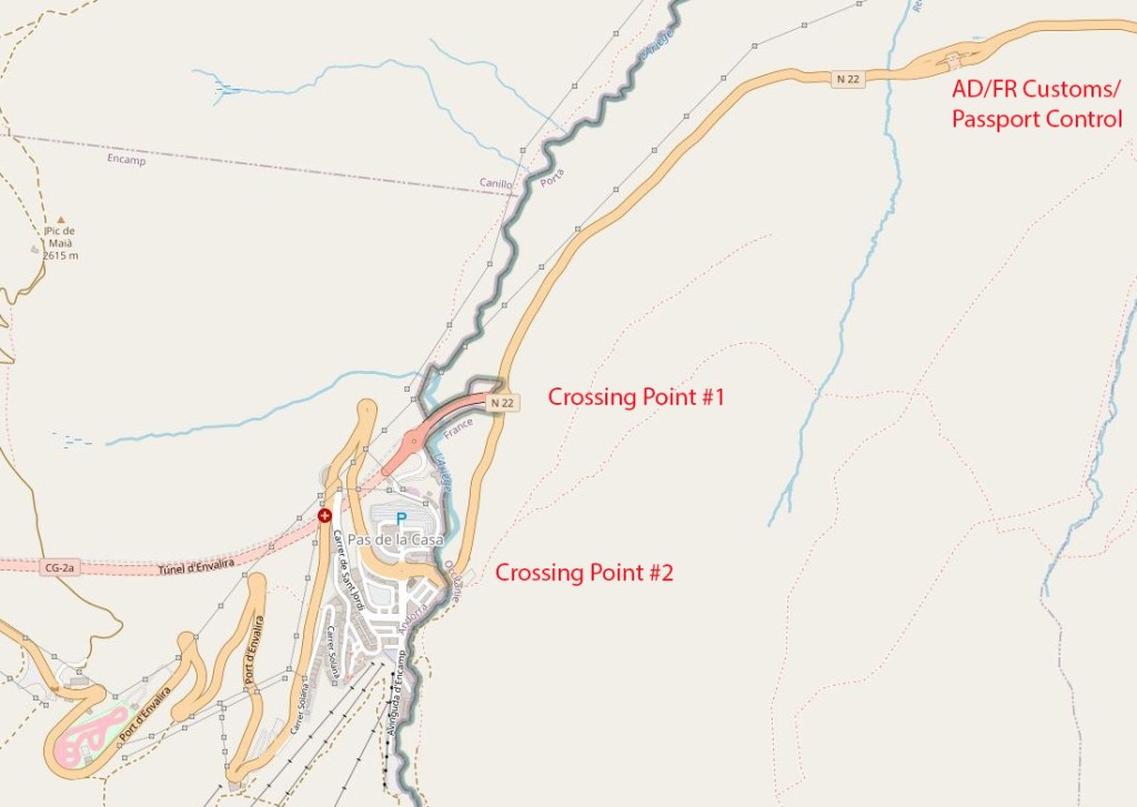 - The customs and passport control facilities that are situated outside Pas de Casa on the RN22 entirely in France. As Andorra is not part of the EU nor the Schengen zone there are full checks and consequent delays. In reality I drove straight through this border twice and was not checked. (Different from the Andorra/Spain crossing point. My report here.)