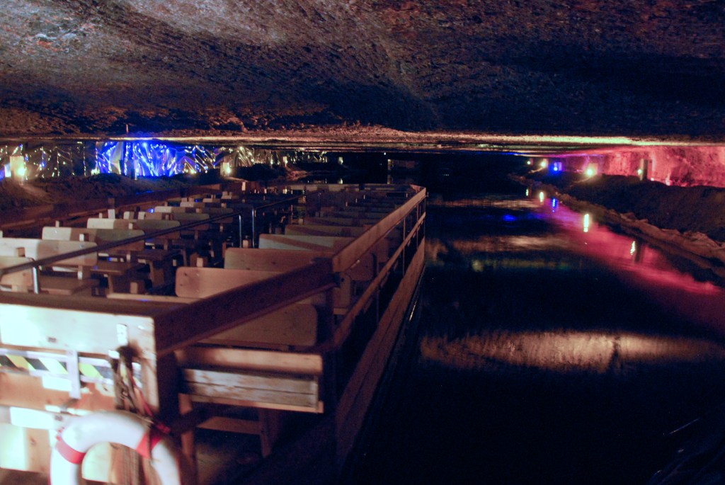 There is a 90-minute guided Salzwelten-tour where visitors put on white coveralls to protect their clothes inside the mine. There is a electric train ride into the mine which leads to two sets of wooden slides. Visitors straddle two wooden rails and slide quickly down to the lower level of the mine. There is a boat trip across an underground lake before exiting the mine. The tour crosses the border twice, the German section of the mine is a pene-enclave