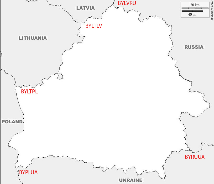 Belarus – Ukraine Border: is 975.2 km long including 325.9 km by rivers. It starts from the BYPLUA tripoint to the west on the River Bug and stretches to BYRUUA in the east.