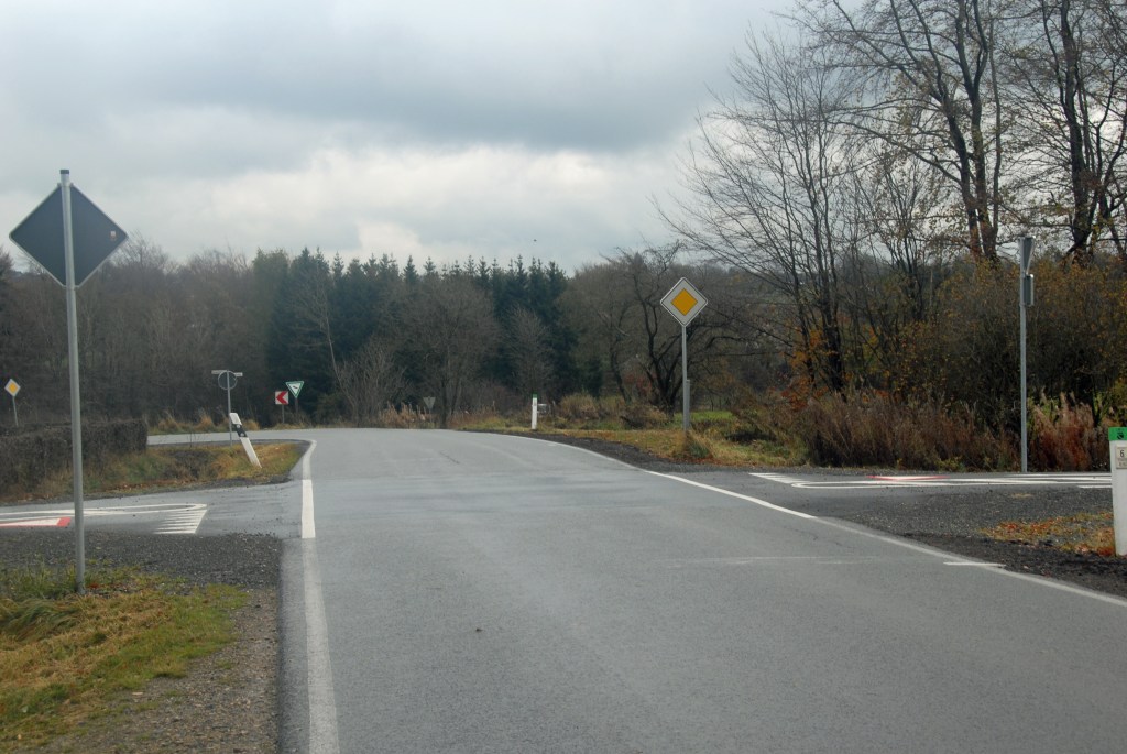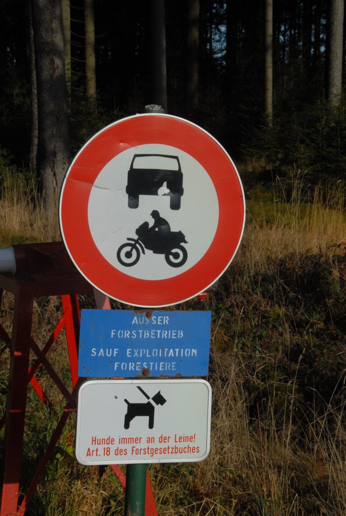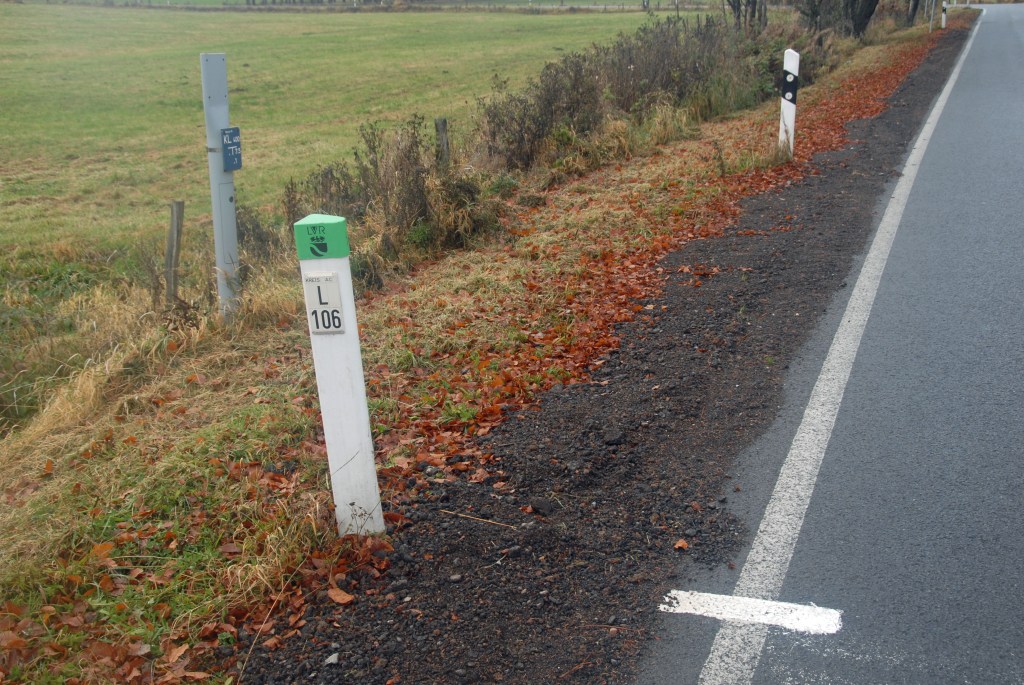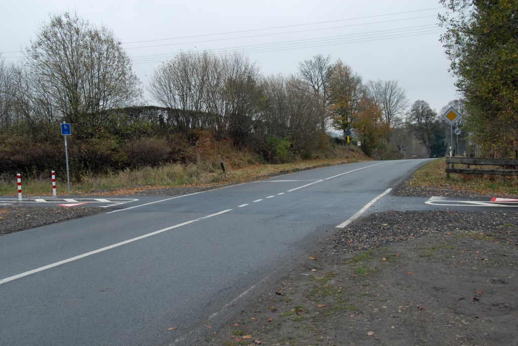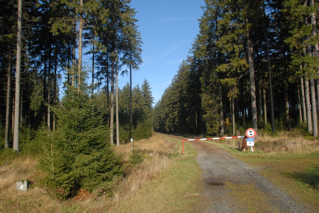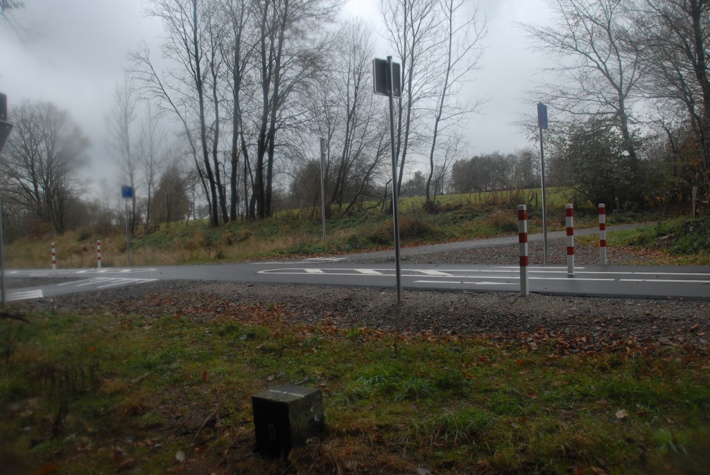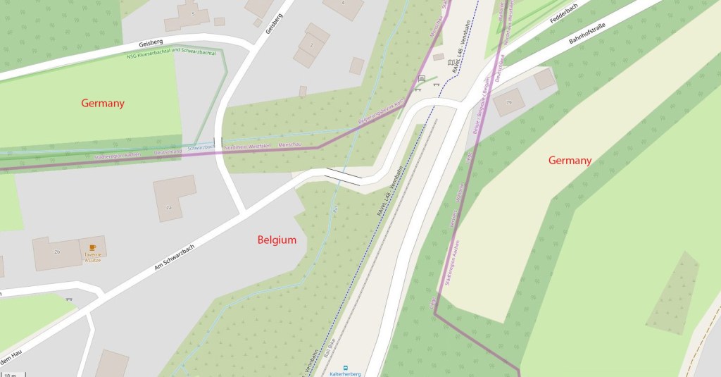 This question was posed by Hugh Wallis 2007 here. The map below indicates that the Vennbahn border follows the road whilst the other side of the road is Belgium proper. On the ground there was no indication of the road changing to Belgium and the road markers were German.