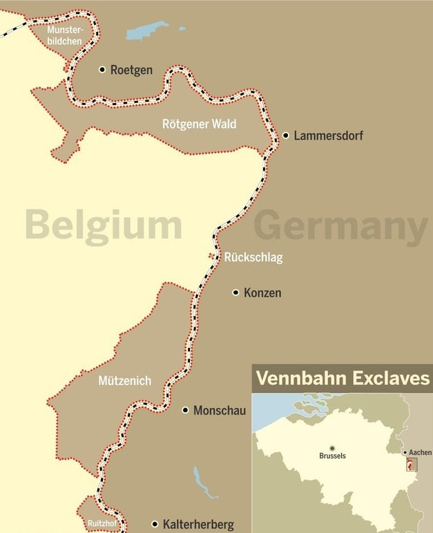The Vennbahn is a former railway line from Aachen to Luxembourg. When built in 1889 the railway was located entirely in Prussia. Following Germany’s defeat in WW1 the areas of Eupen and Malmedy were added to Belgium in 1920 and 1921 through the Treaty of Versailles. In order to manage this now cross border railway the railway track was ceded in perpetuity to Belgium, thereby creating German exclaves cut off from Germany by the railway.