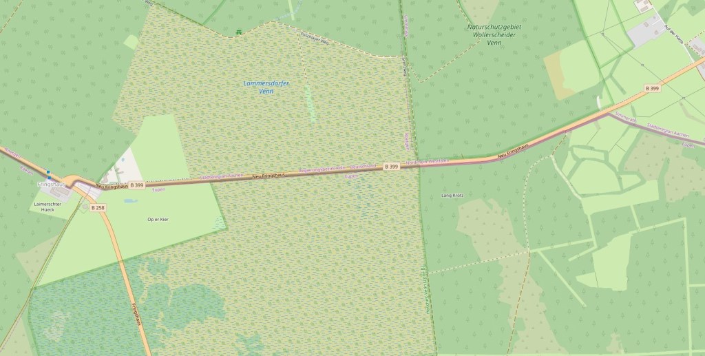 This area is of interest because at one time it formed a Belgian counter-exclave from 6 November 1922 until 23 April 1949, while Germany owned the connecting roads that were part of the Roetgener Wald enclave. These roads met at a traffic island north of Fringshaus, with the 2,279 m2 island itself being a part of Belgium. This counter-enclave ended in 1949 when Belgium annexed the German roads that intersected at the traffic island. In 1958, when Belgium returned the east-west road to Germany, this traffic island also became part of the Roetgener Wald exclave. The road is still of interest as it crosses a small part of Belgium with no connection with the wider Belgian network.