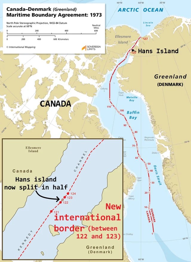 Canada – Greenland (Denmark) Border the maritime boundary between Canada and Greenland originates in the North Atlantic Ocean and follows a northerly course through Davis Strait and Baffin Bay until it reaches the Arctic Ocean. The boundary was established through a bilateral agreement that was finalized in 1973. A territorial sovereignty dispute (now solved) over tiny Hans Island briefly interrupts what is otherwise the longest maritime boundary in the world at 2,646 kilometres.