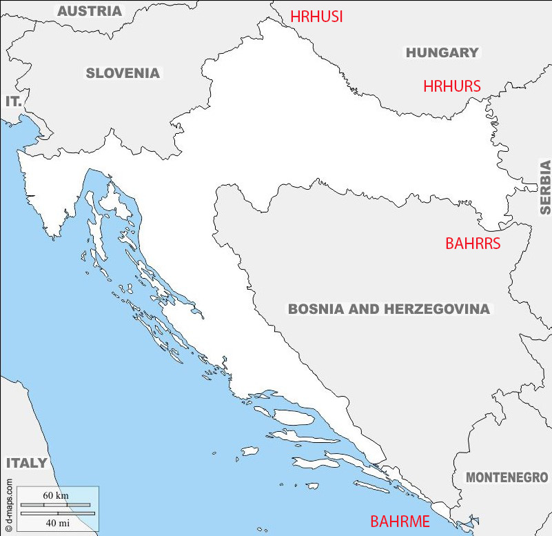 | 1 | BAHRME | Bosnia and Herzegonia – Croatia – Montenegro | Dry | 42°33’32″N 18°26’15″E | The tripoint is located very close to the Sitnica (ME) border crossing control post. The is no evidence that it has been demarcated, although the border might have cairns (rather than border markers). |