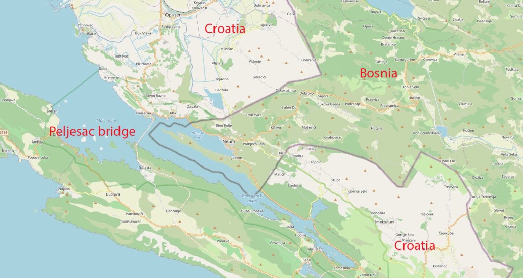 An interesting aspect of the border between the 2 counties is the Neum Corridor.