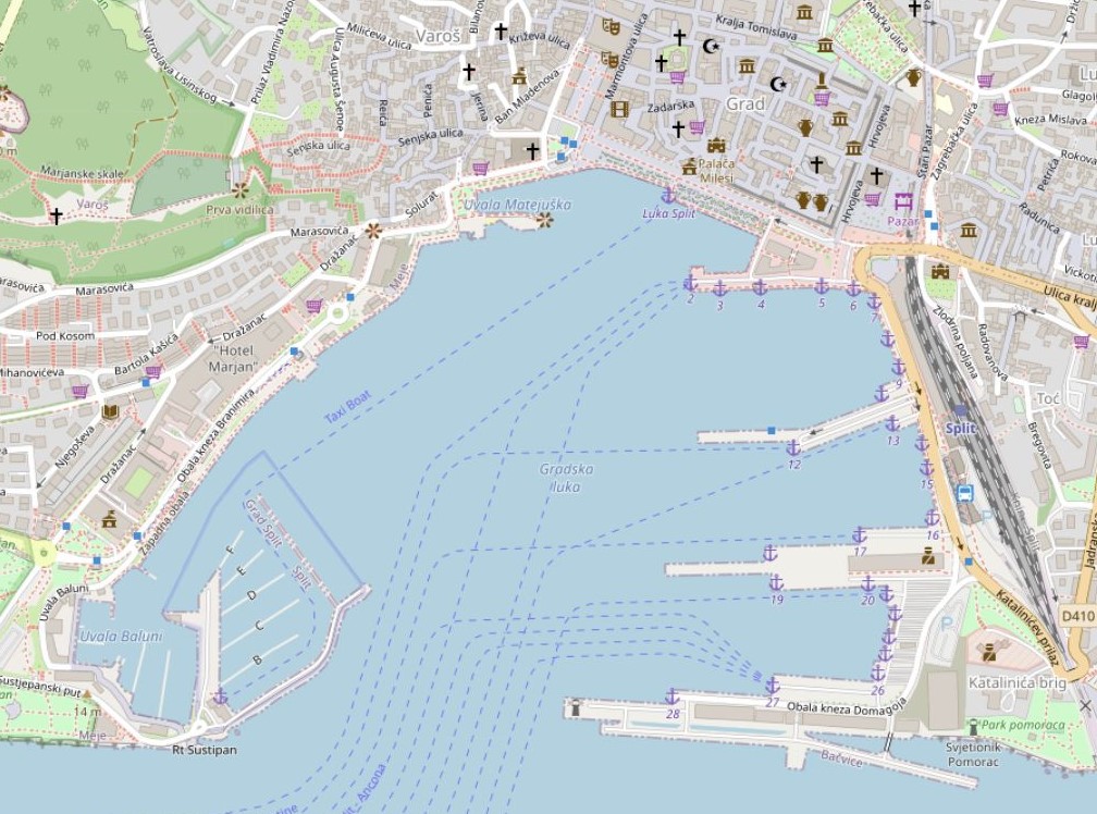 In addition to being important as a domestic terminus, the port of Split is a major cruise destination as well as being an international crossing point between Croatia and Ancona in Italy. As such it has the normal external passport and custom facilities.