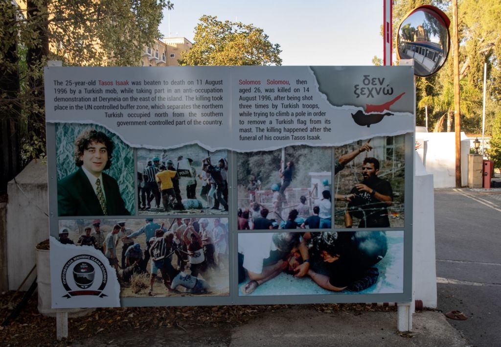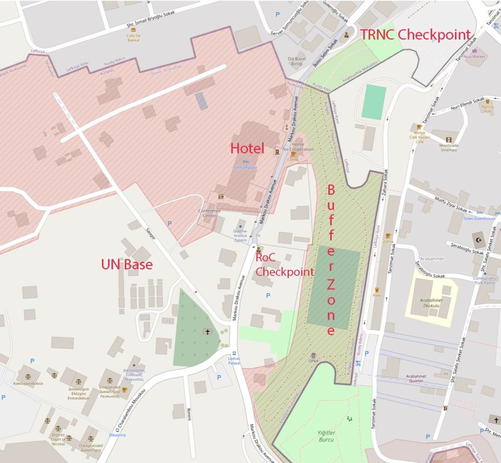 Moving onward towards the RoC checkpoint there are 2 further POI’s. The office of the Kyrenia municipality whose mission is raising awareness and sensitising on the matter of the Cyprus Problem both in Cyprus and abroad as well as promoting the interests of the displaced population through the organisation of events, meetings with local and international actors, constant participation in international forums and the production and projection of awareness material (films, photographic exhibitions, booklets, etc.) among others. There are nine municipalities that have been displaced: They maintain their legal identity through the alternative Mayors and Municipal Councils. The second building is the Greek Embassy, there are further Greek embassy buildings in the city. For further information of the embassies of Nicosia I visited as part of this trip click here or on the image below.