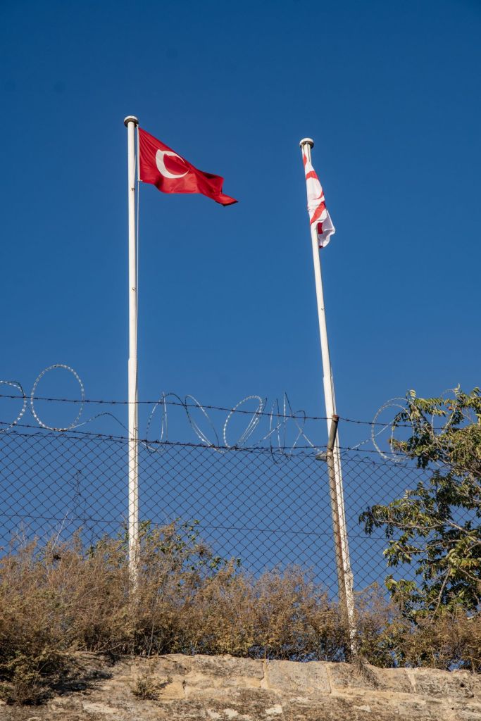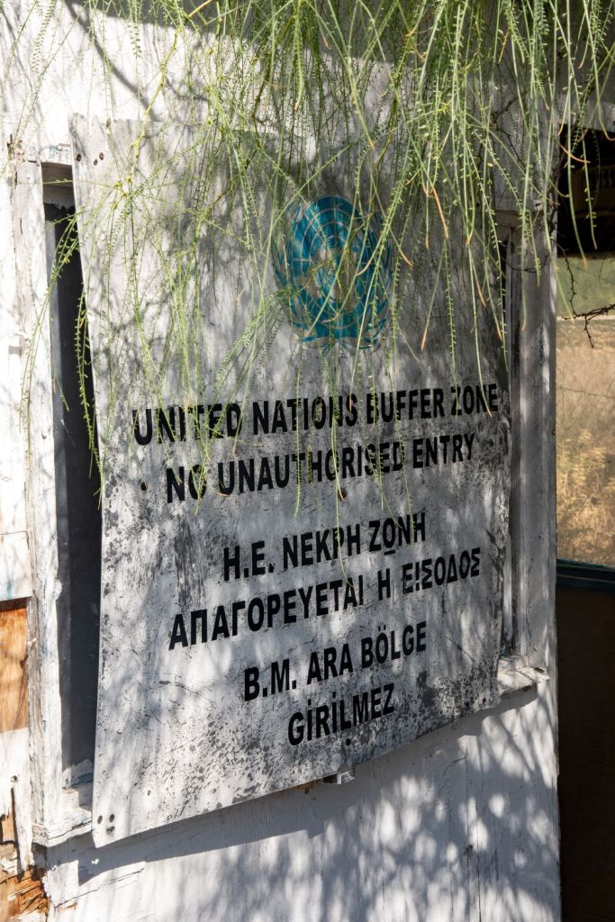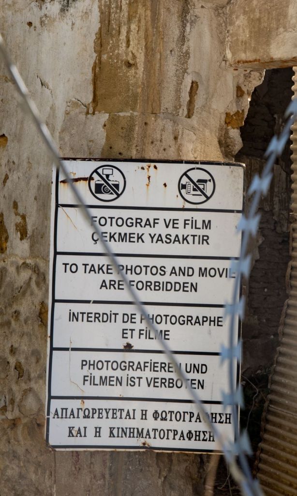 Our next stop was the Green Line Hut, an abandoned security checkpoint situated close to the buffer zone. A Greek flag painted on a nearby wall and a series of ‘Stop’ signs were visible reminders of its previous function. These were overshadowed by an even larger warning sign telling tourists that photos were forbidden. The hut overlooks an access gate into the buffer zone to be used by UN forces only