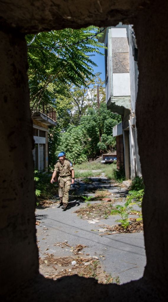 The penultimate point of our walk along the southern edge of the buffer zone was UN OP 75 which is another UN access point and provides a clear view of the bullet and shell damage caused in the initial conflict, 50 years ago