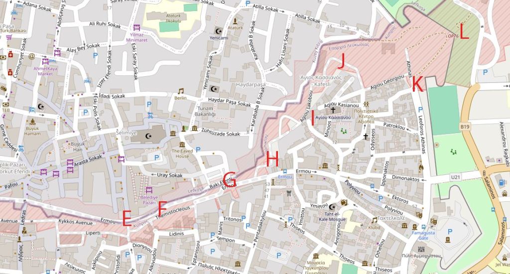 Ledra Street is a crossing point in the UN buffer zone – known as the Green Line – between the northern Turkish Cypriot part of the city and the southern Greek Cypriot part. It is the site of the former Ledra Street barricade which I visited in 2001 (details here), across the United Nations buffer zone. The barricade symbolised the division of Nicosia between the Greek south and Turkish north. It was removed in April 2008 and Ledra Street became the sixth crossing between the southern and northern parts of Cyprus. The Republic of Cyprus does not maintain any immigration checkpoint at Ledra Street or any other Green Line crossing. It however conducts identification checks on people entering the South from the North. It feels however very like a normal crossing.