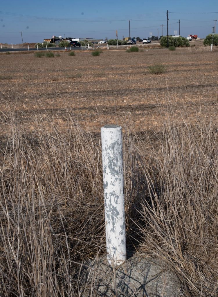 The border markers were located in fields, alongside buildings, and within an orchard where we met a farmer who was picking olives.