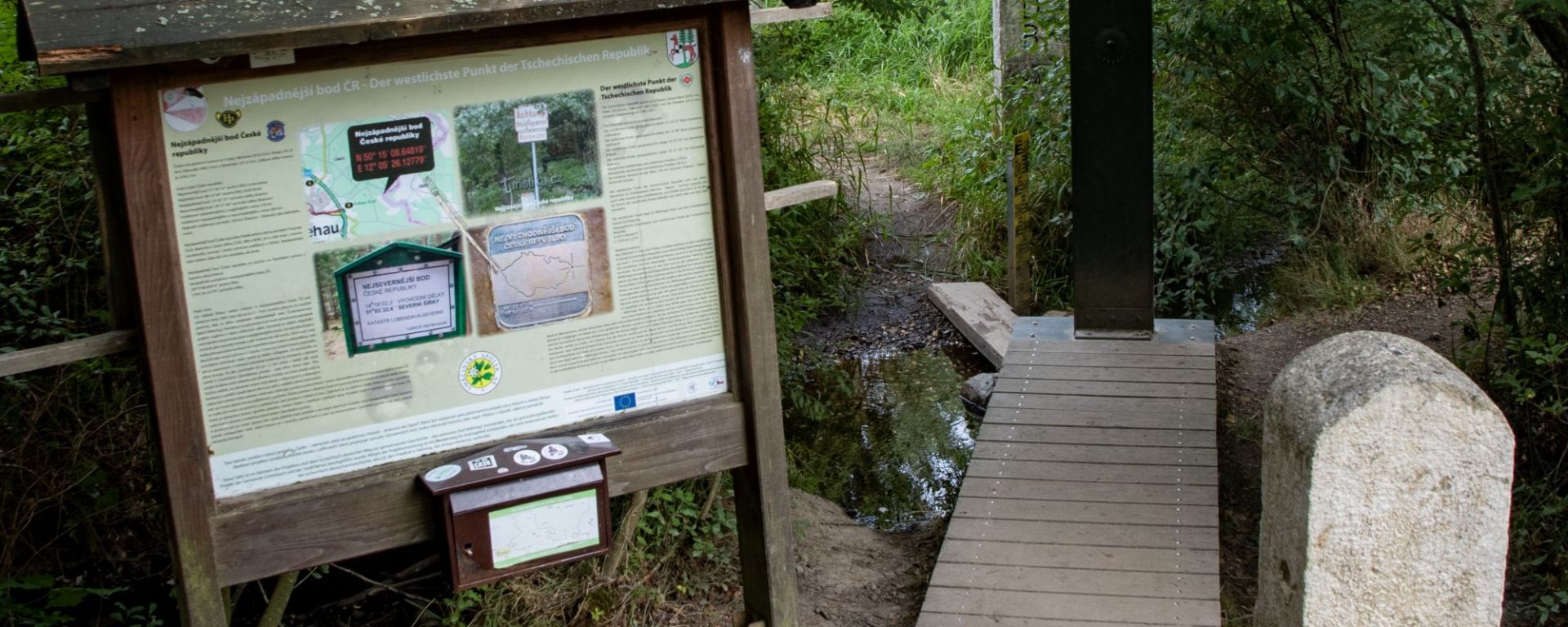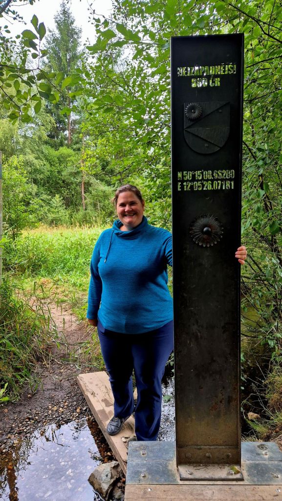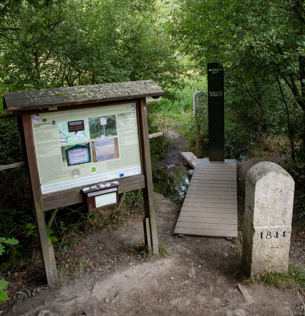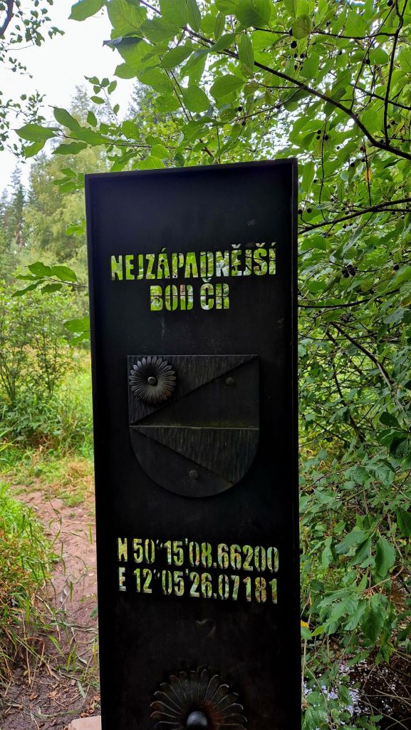 The westernmost point of the Czech Republic is near the village of Krásná, in the Karlovy Vary Region, close to the town of Aš, located in the Aš Panhandle, marked by border marker No. 1844, with coordinates approximately 50°15’09″N, 12°05’26″E, accessible via hiking trails. The Czech-German border here is formed by a stream. Many people do not realise that Bohemia is much further west than major German cities such as Berlin and Leipzig, and was misplaced into the eastern bloc in 1945.