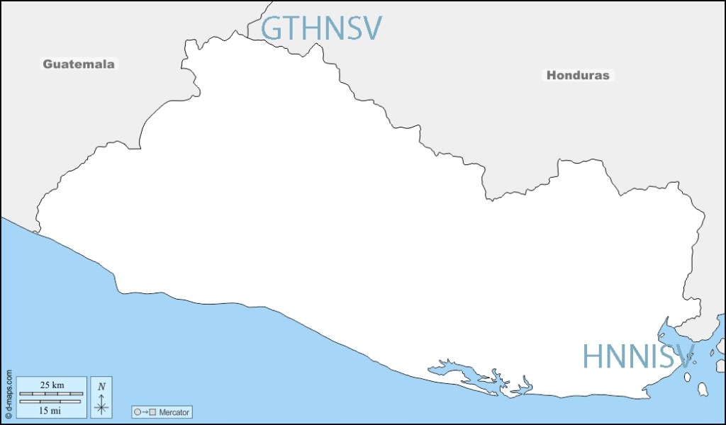 El Salvador – Nicuagua border do not share a land border. They do however do meet in the Gulf de Fonsca which is is jointly shared by 3 countries (including Honduras). HNNISV is a complex dual condominium of shared waters. The ICJ in 1992 determined that Nicaragua, Honduras and El Salvador were to share control of the remaining water area in the gulf as a “tridominium” shared in common. The littoral zones abut each other in a way that forms two separate areas of tridominium waters in the gulf.