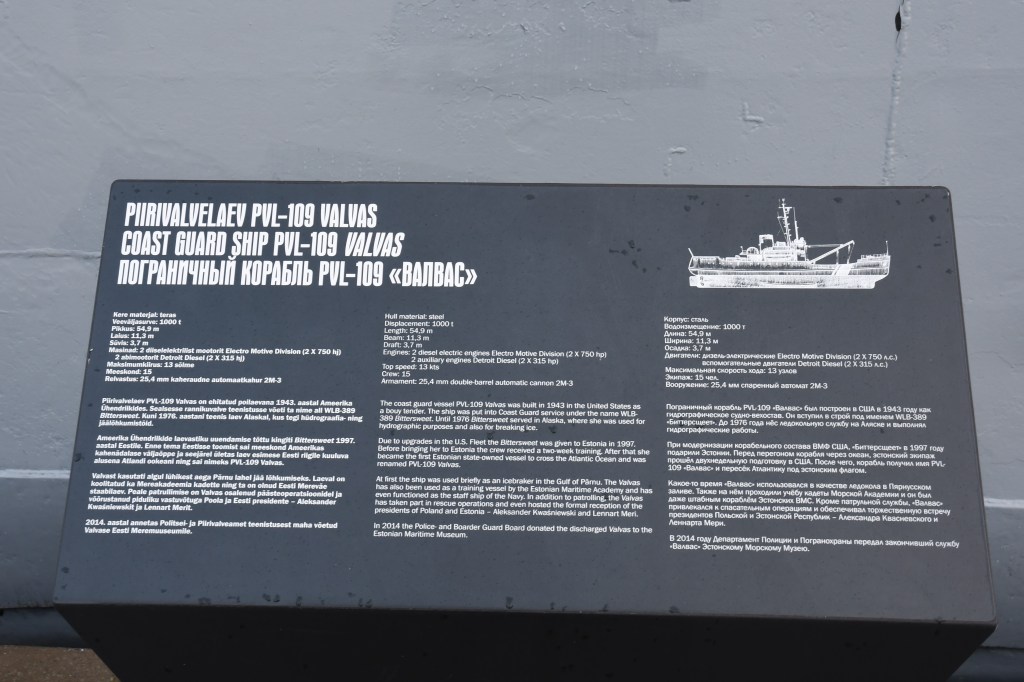 PVL 109 Valvas was initially a Iris-class bouy tender built for the United States Coast Guard. USCGC Bittersweet (WLB 389) was commissioned in 1943 and was based during WW2 in Alaska. The ship was fully renovated in 1976-1978 and again in 1991. In the early 1990’s when Estonia was seeking to develop its post independence maritime capacity and to join NATO the US gave a number of vessels to Estonia. In 1997 the Estonian crew of 20 men were sent to Boston where they received necessary training for operating the vessel. The ship was renamed Valvas and the Estonian flag was hoisted on 5 September 1997. It became the first Estonian ship to cross the Atlantic post independence flying the Estonian flag. The ship was involved in search and rescue and as an icebreaker. Valvas was withdrawn from active service in 2010. In 11 July 2014 the ship was handed over to the Estonian Maritime Museum and is located in the Lennusadam harbor (Tallinn).