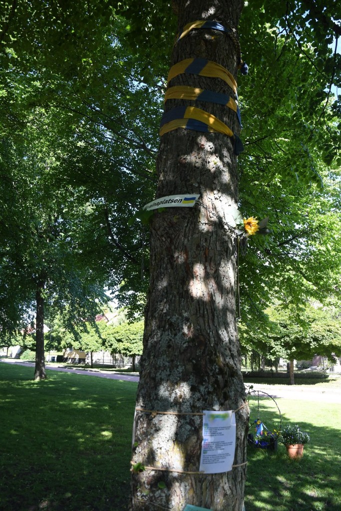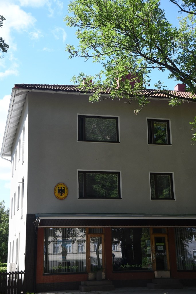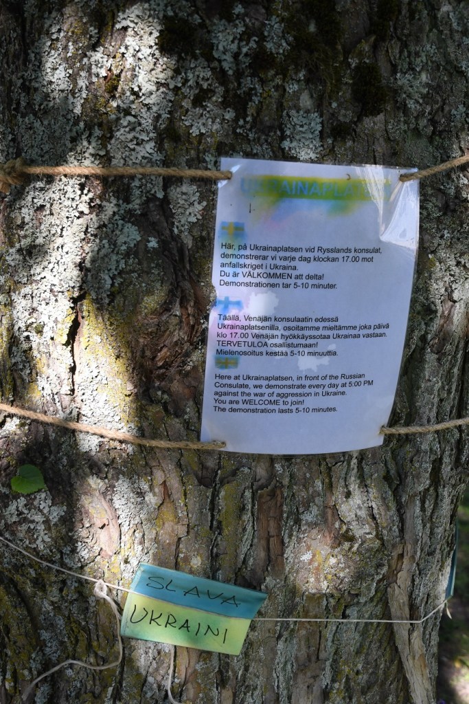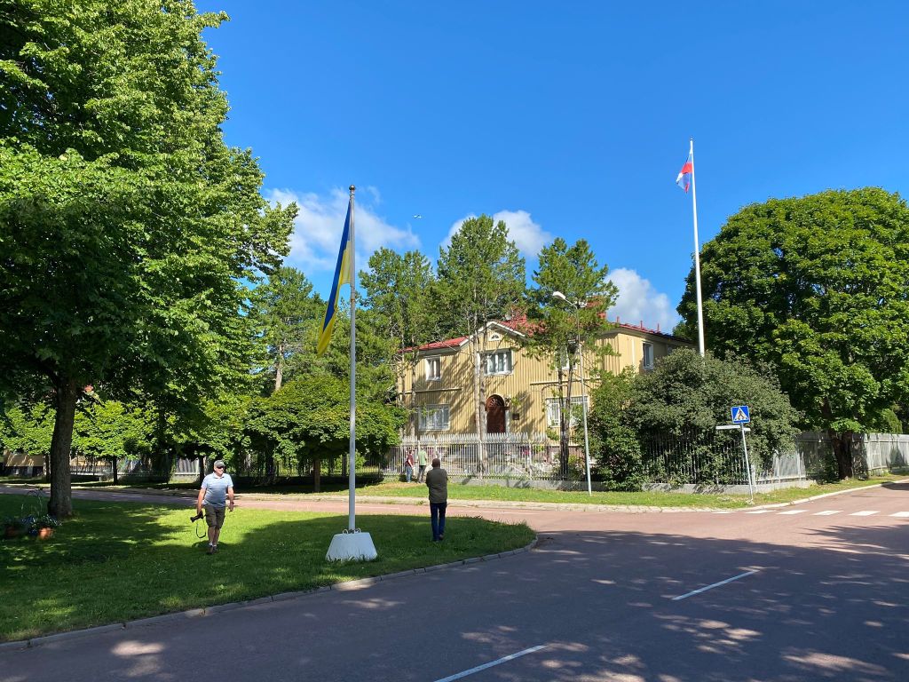 Opposite the Consulate there are visible symbols of Finnish disapproval of the Russian invasion of Ukraine.