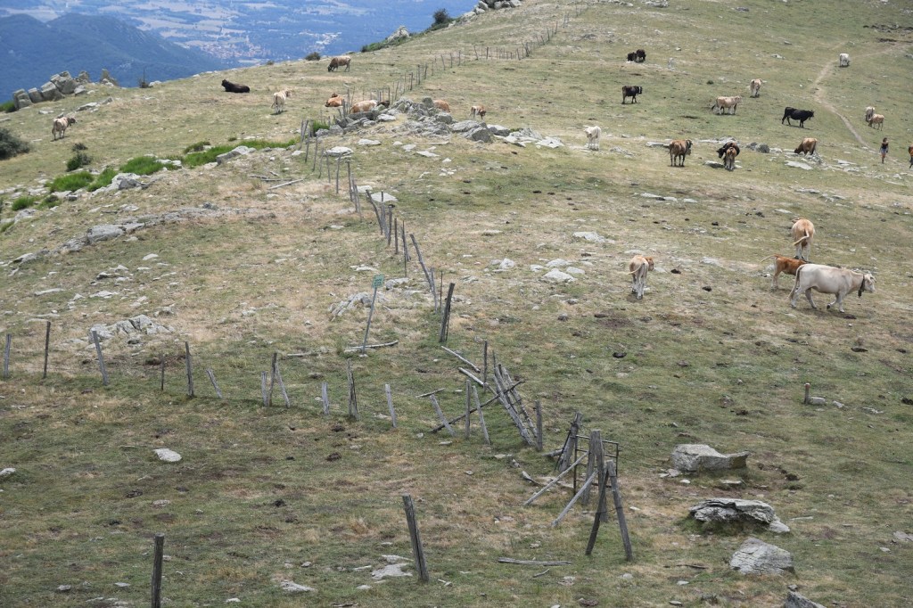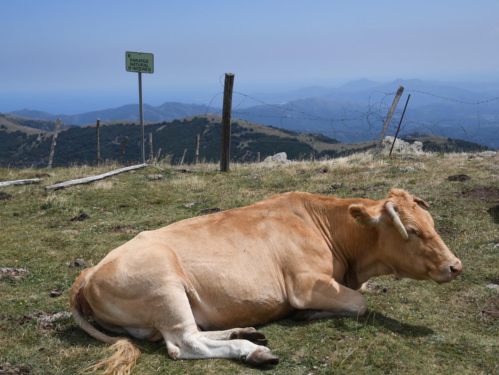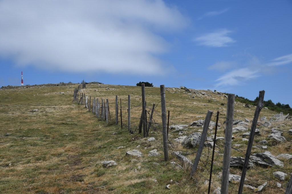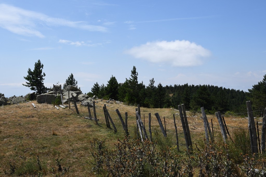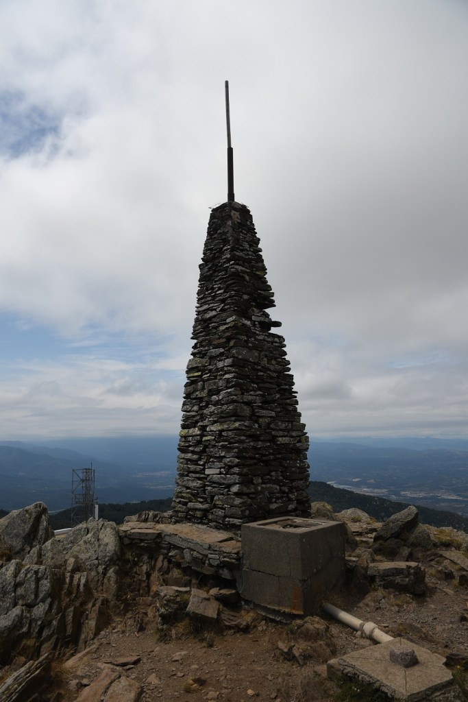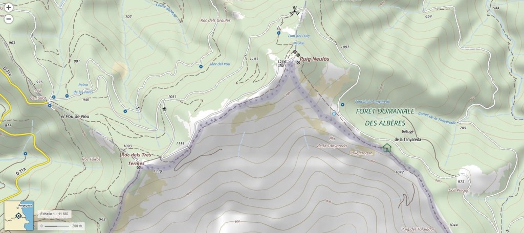 This is one of the most popular hikes in the eastern Pyrenees of France, the Pyrénées Orientales. Puig Neulós at 1256 m (French: Pic du Néoulous) is the highest mountain of Albera Range, an eastern prolongation of the Pyrenees in Catalonia, between France and Spain. There are some antennas on the summit, an impressive cairn and a French triangulation point. There is a paved road on the French side right to the summit, but restricted for the last few kilometres. The summit, as well as most of the southern side of the range is part of the Paratge Natural d’Interès Nacional de l’Albera natural reserve. Walking to the summit involves walking along the French – Spanish border which is marked by a rickety fence divided the fields. Spanish signs walking and national park signs are the only indication that you have entered Catalonia. On the Spanish side there is a futher point of interest with a restored 17th Century snow store 50m from the border.