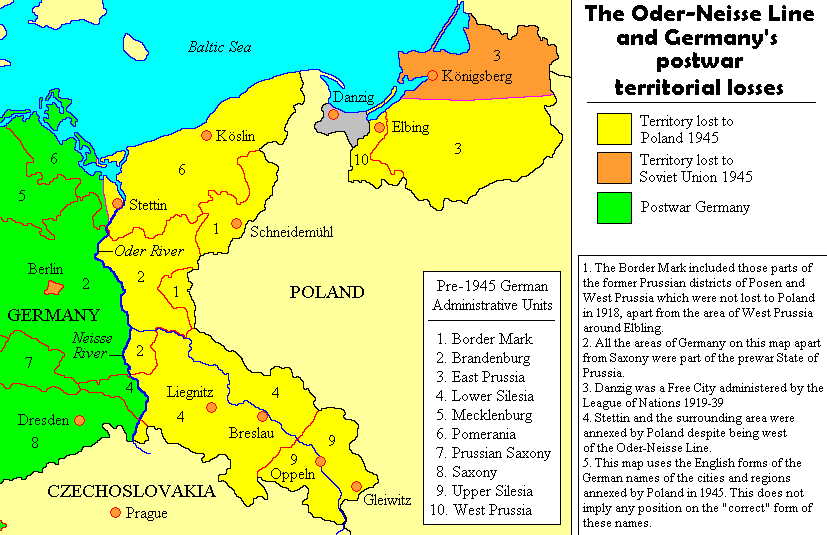 This was agreed upon by the main Allies of World War II – the Soviet Union, the United States, and the United Kingdom, at the Soviets’ insistence, and, without any significant consultations with Poland (or Germany), at the Yalta Conference and Potsdam Conference. This border was a compensation to Poland for territories lost to the Soviet Union as a consequence of the Molotov–Ribbentrop Pact, and resulted in significant westward transfers of German population from the Recovered Territories, matching the Polish population transfers from the Kresy territories. It roughly matched the centuries-old, historical border between the Medieval Polish and German states.[3] It divided several river cities into two parts – Görlitz/Zgorzelec, Guben/Gubin, Frankfurt (Oder)/Słubice, Bad Muskau/Łęknica.