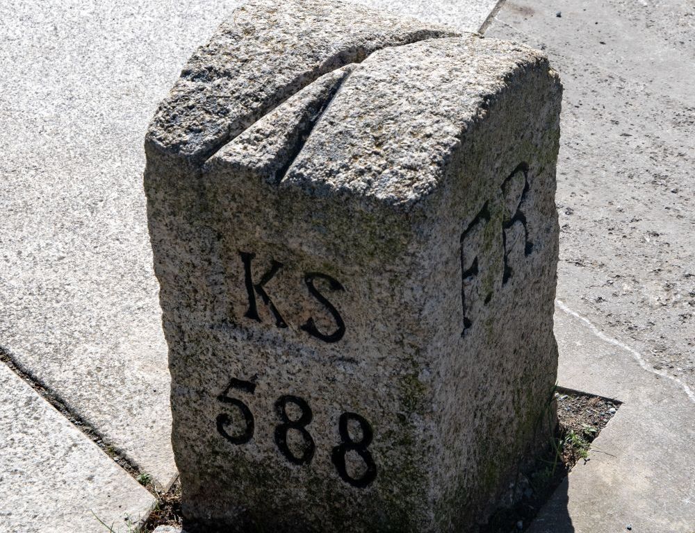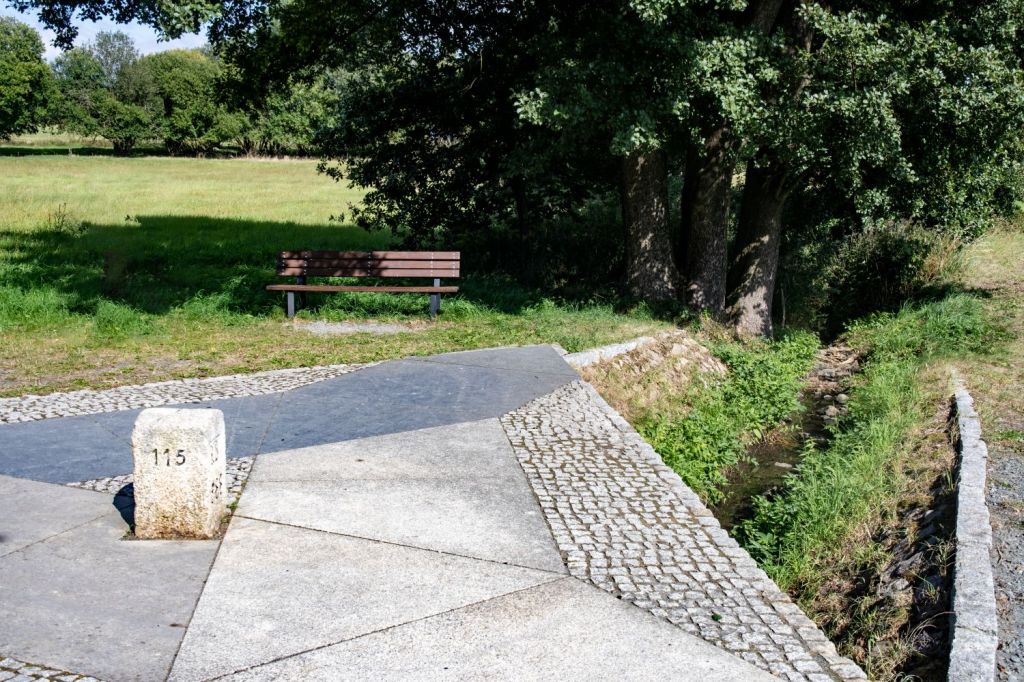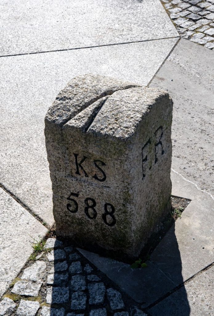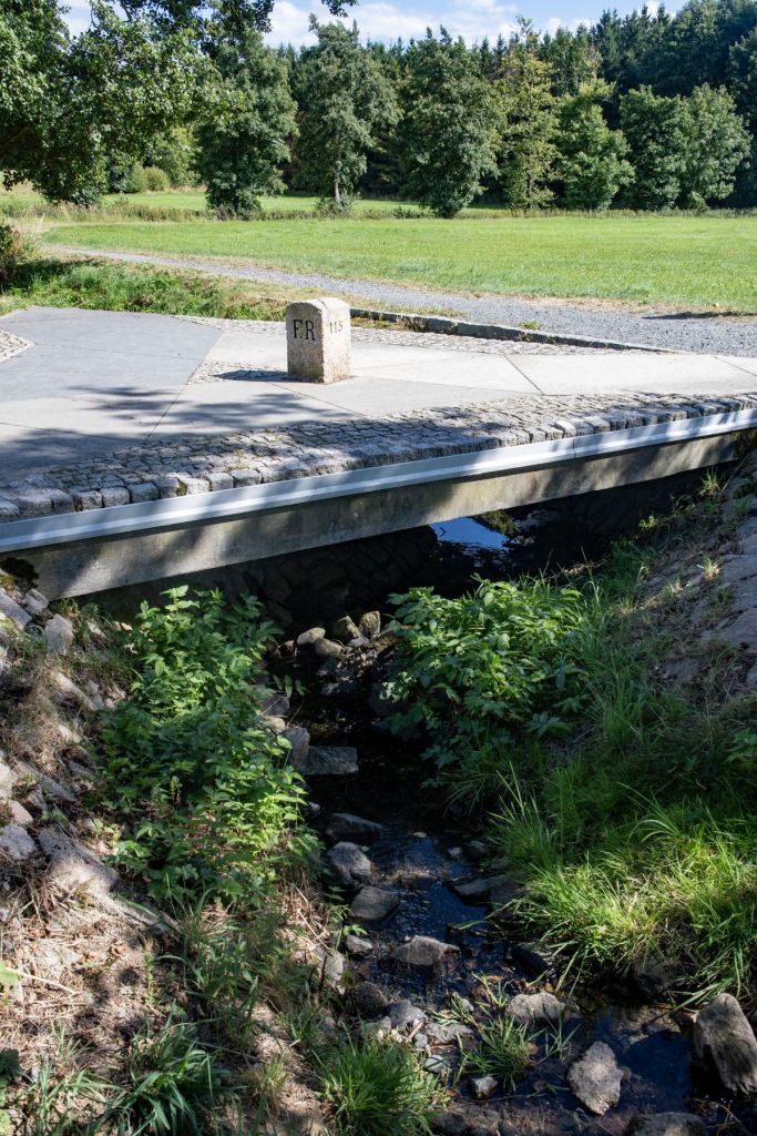 The Drei-Freistaaten-Stein is the border marker that marks the tripoint of the German states of Bavaria , Saxony , and Thuringia . These three are the only states that officially bear the designation ” Free State “, and therefore this internal tripoint is unique out of the 15 that exist within Germany. The stone is located at the point where the boundaries of Münchenreuth (municipality of Feilitzsch , district of Hof , Bavaria), Grobau (municipality of Weischlitz , Vogtland district , Saxony), and Gebersreuth (town of Gefell , Saale-Orla district , Thuringia) meet. This point was designated as a tripoint by the border conventions of the Kingdom of Saxony and the Kingdom of Bavaria on August 13, 1840, and with the Principality of Reuss-Gera on October 23, 1854. Therefore, the abbreviations of these states – KB, KS, and FR – are engraved on the sides of the stone. Since the opening of the inner-German border, it has been freely accessible from all sides and was inaugurated as a cultural monument on May 11, 2007. The stone was placed on a triangular slab above the Kupferbach stream and is accessible via a hiking trail. The base is divided into three sections, each covered with a natural stone representing a characteristic building rock of the surrounding regions: Fichtelgebirge granite, Thuringian shell limestone , and Theuma slate .
