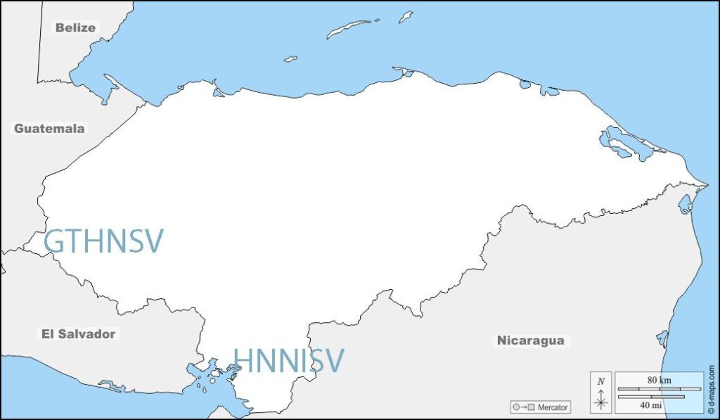 | 2 | HNNISV | El Salvador – Honduras – Nicaragua | 13°07’30″N 87°33’01″W | Wet | Golfo de Fonsca is jointly shared by the 3 countries. It is a historic bay with the characteristics of an enclosed sea, with a strip of territorial waters for each State and the remainder in the central part as condominium waters. The Gulf is divided into: 1) Territorial waters of each coastal State up to 3 miles from its continental coast. 2) Condominium waters (Joint Maritime Zone), formed as residues of the non-territorial body of water in the Gulf of Fonseca. Isla Conejo is contested between HNNI. |