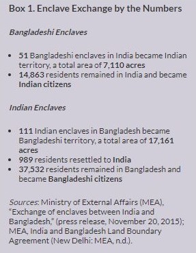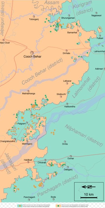 The border area between India and Bangladesh was characterised by an number of enclaves. Within the main body of Bangladesh were 102 enclaves of Indian territory, which in turn contained 21 Bangladeshi counter-enclaves, one of which contained an Indian counter-counter-enclave – the world’s only third-order enclave. Within the Indian mainland were 71 Bangladeshi enclaves, containing 3 Indian counter-enclaves. A joint census in 2010 found 51,549 people residing in these enclaves: 37,334 in Indian enclaves within Bangladesh and 14,215 in Bangladeshi enclaves within India. Over the years many of these enclaves were exchanged. In May 2015 a large scale land swap occurred. This resolved many challenges the inhabitants of the enclaves experienced in terms of access to services and citizenship.