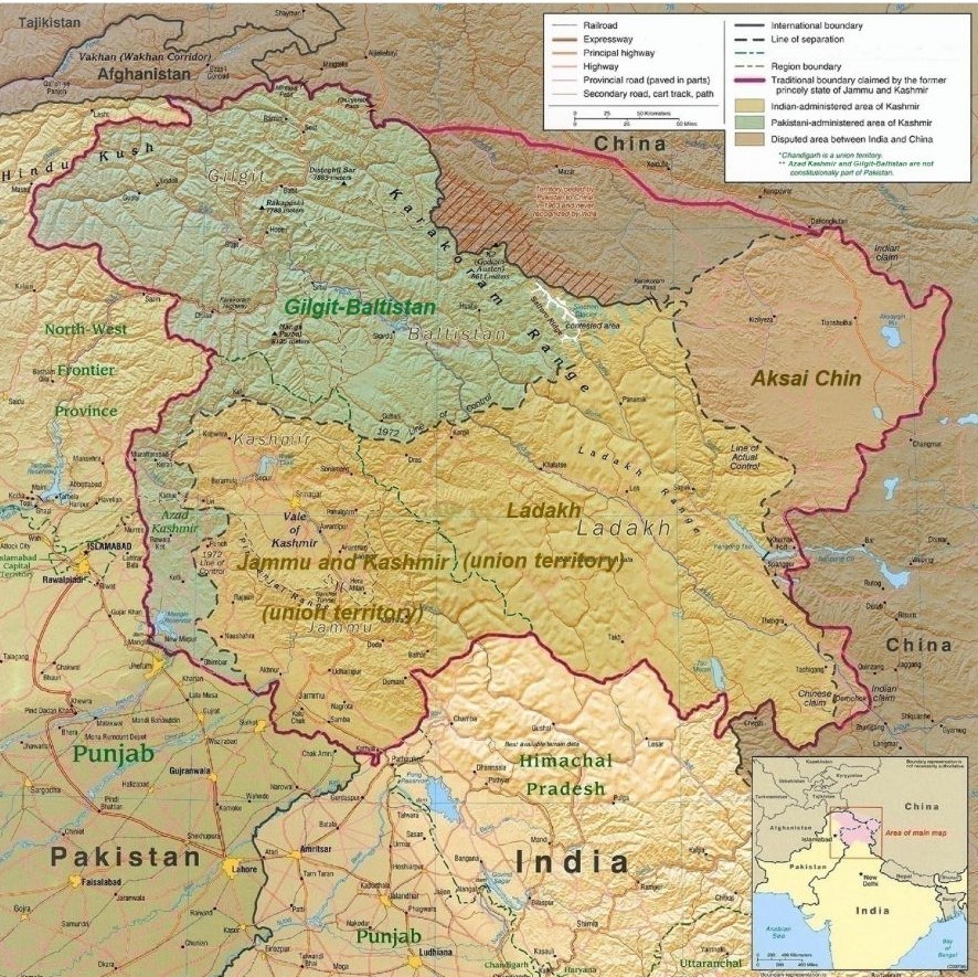 The whole area is contested with Pakistan claiming the predominately Muslim area of Kashmir as theirs. Contrastingly, India claims Azad Kashmir and Gilgit–Baltistan.