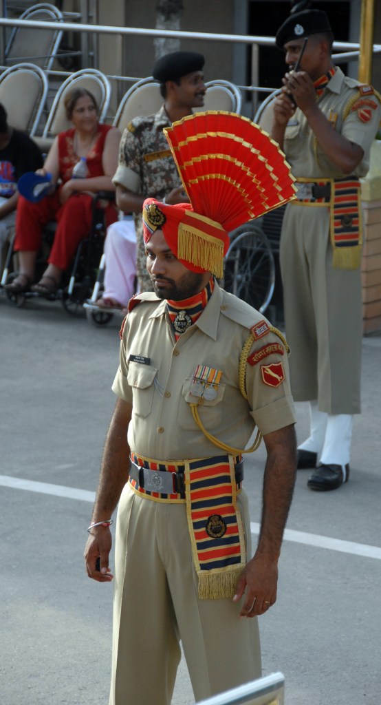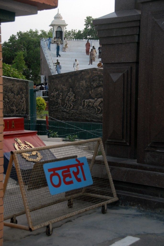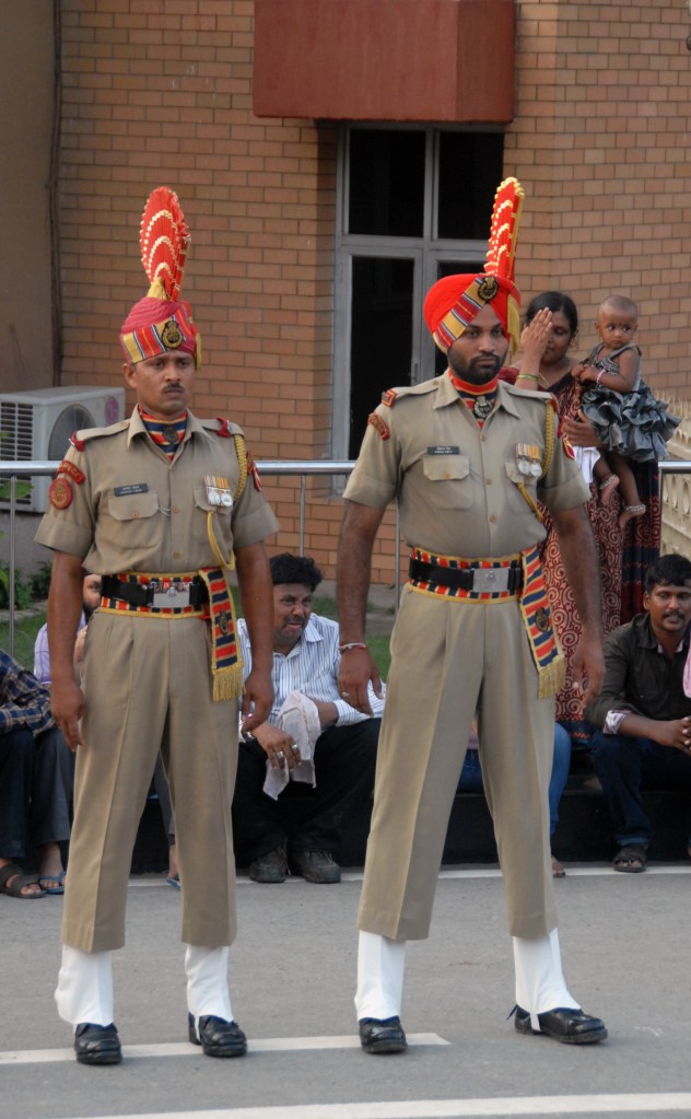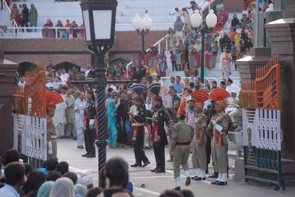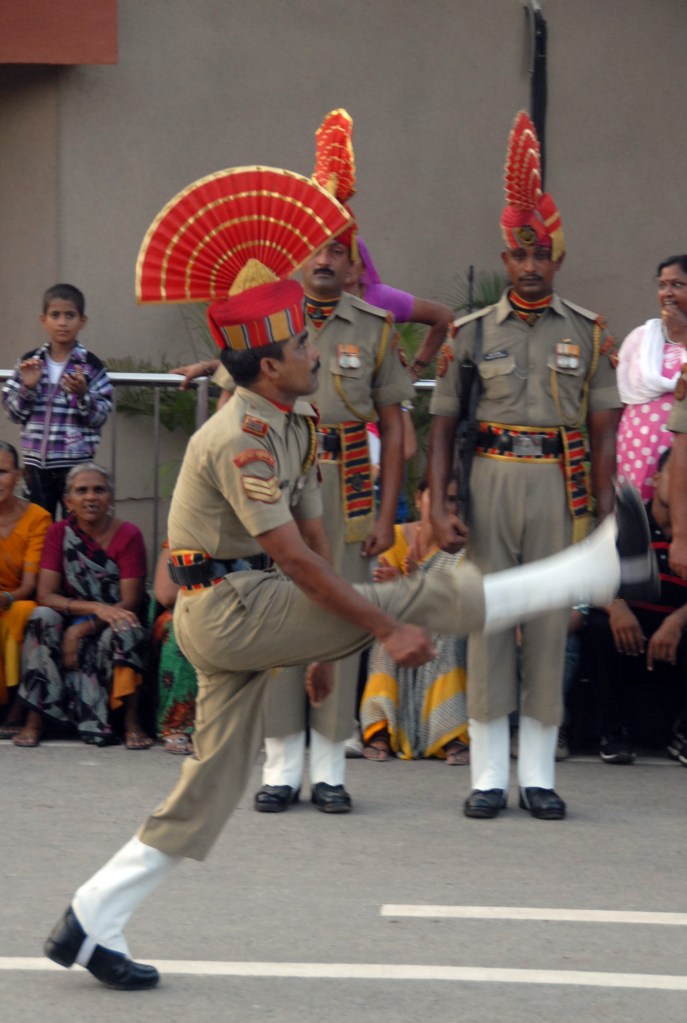 Each evening a elaborate, well coordinated border closing ceremony occurs where the the security forces of India (Border Security Force, BSF) and Pakistan (Pakistan Rangers) engage in choreographed displays of marching, kicking their legs higher than seems possible, stamping of feet and mock displays of aggression ending with the briefest of handshakes as the flags are lowered.