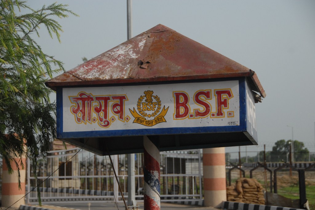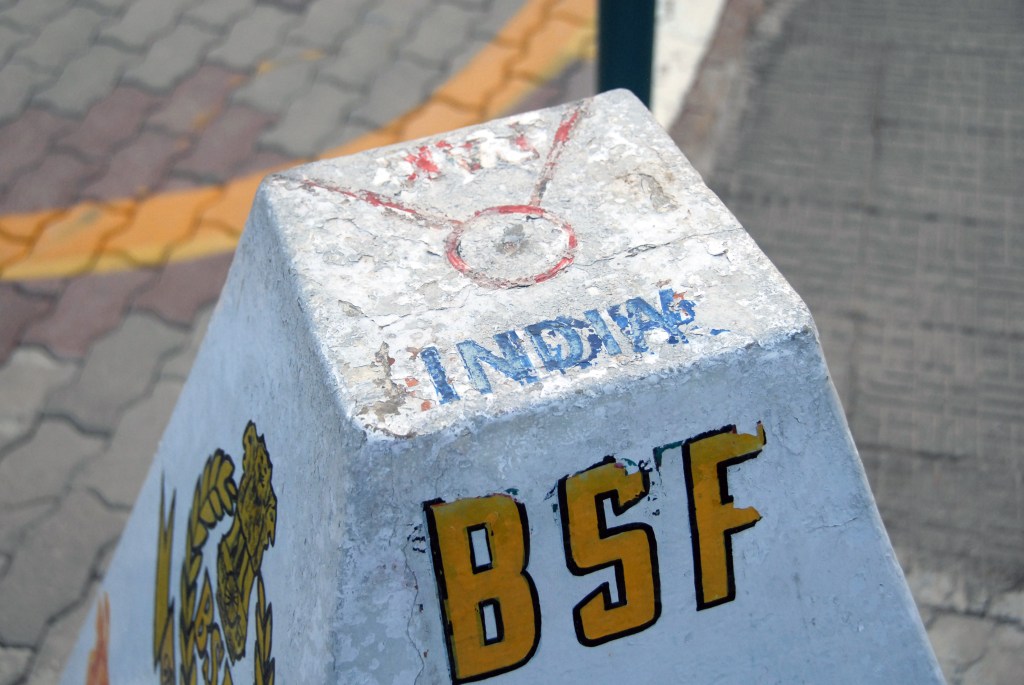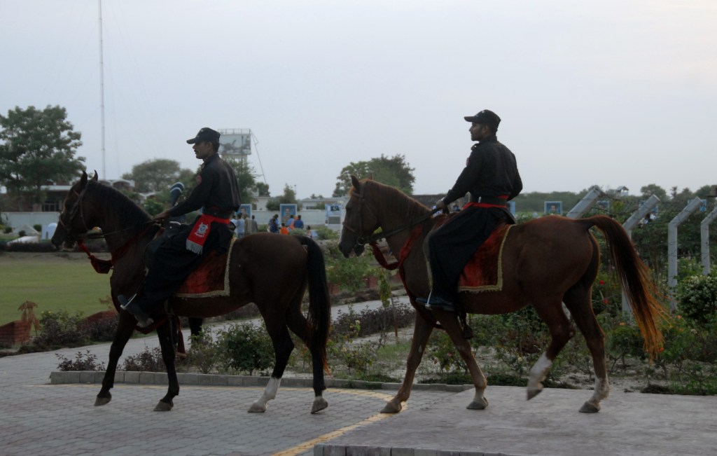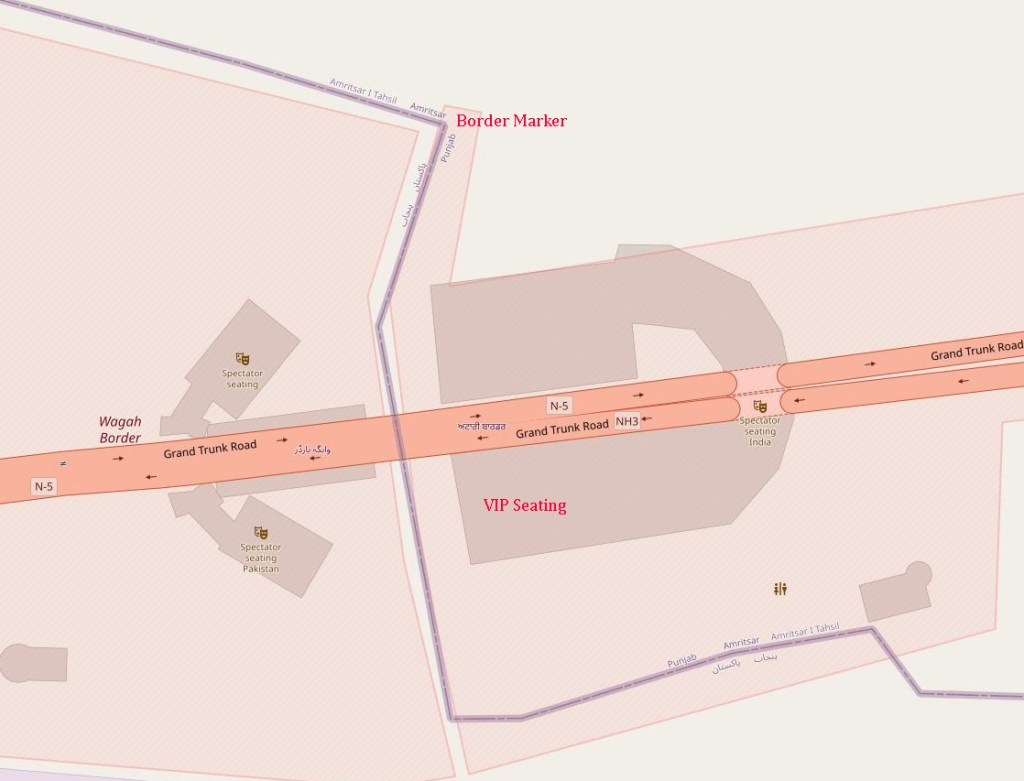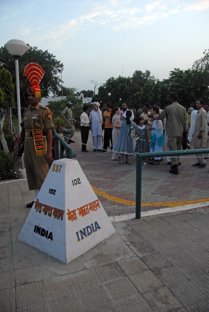Each evening a elaborate, well coordinated border closing ceremony occurs where the the security forces of India (Border Security Force, BSF) and Pakistan (Pakistan Rangers) engage in choreographed displays of marching, kicking their legs higher than seems possible, stamping of feet and mock displays of aggression ending with the briefest of handshakes as the flags are lowered.