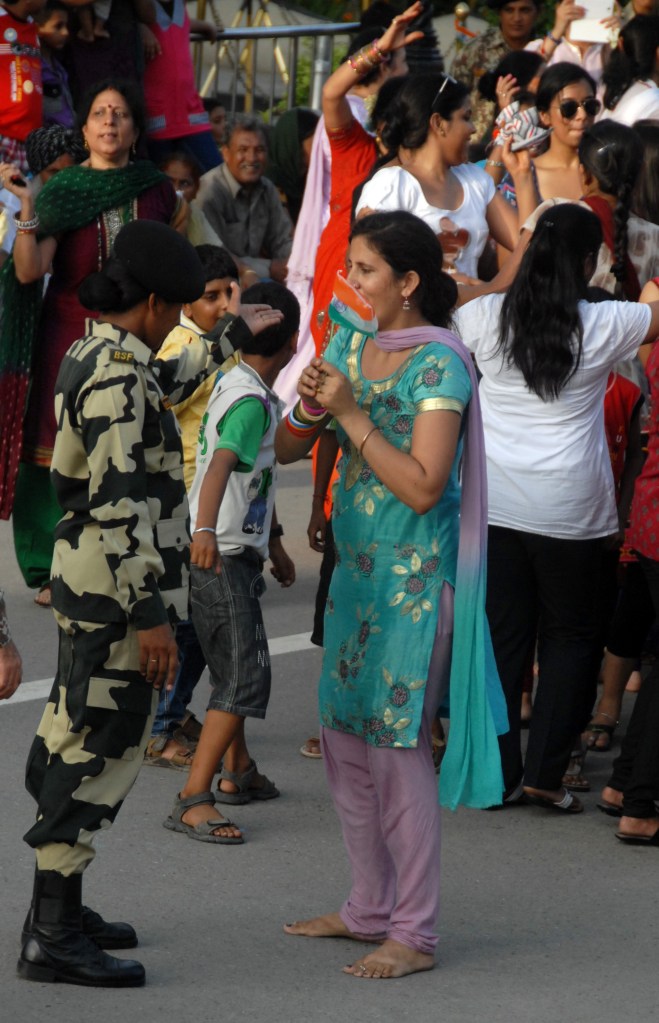 Sitting in the VIP enclosure it was just a riot of sounds and images with dancing, women running with Indian flags towards the border gates, and singing and chanting.