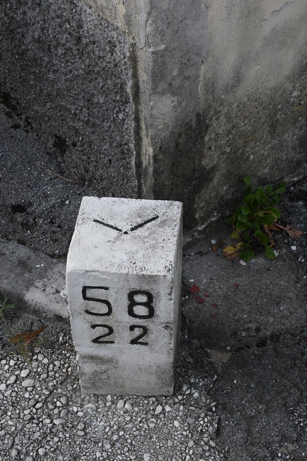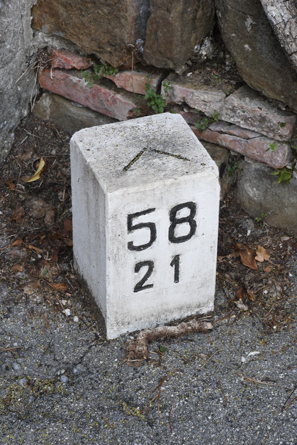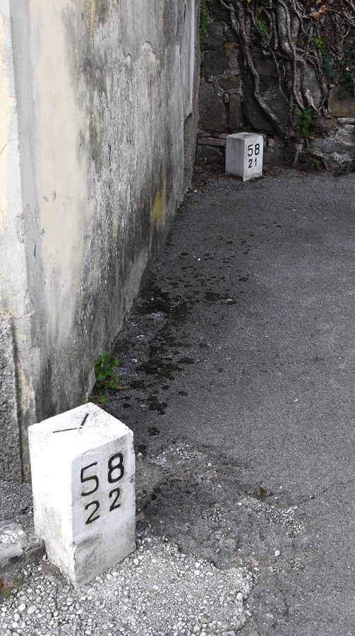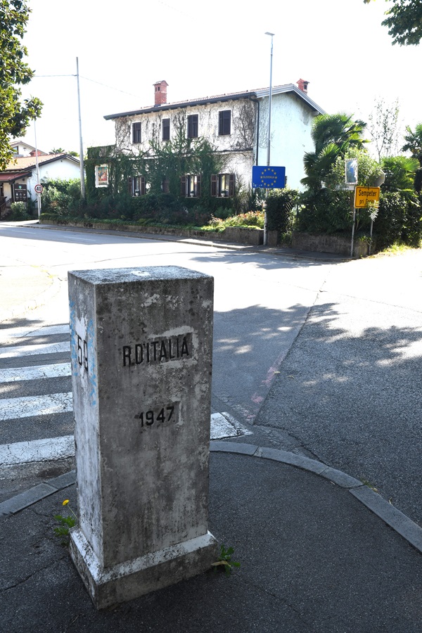 This border crossing point links the Italian road of Via Vittorio with its Slovenian equivalent of Goriška ulica. Here the border cuts diagonally across the street marked on each end by different style border markers. The border then follows the edge of the Italian properties being marked by additional intermediate border markers.