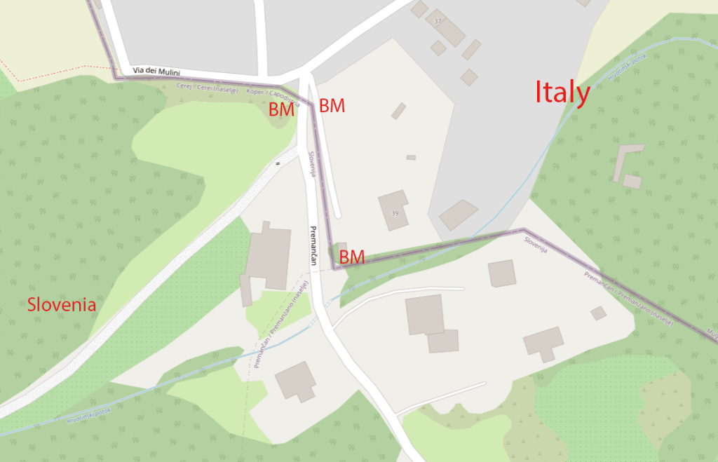 The Italian town of Muggia has a number of small border crossings with neighbouring villages in Slovenia. This one is very small, and is interesting insofar as there are a number of border markers and in this case they follow the Italian property line east of the crossing. On the ground it is difficult to identify where exactly the border is. There are additional local signs, including a 1m to the border (or town limits). I visited this point as part of the IBRG SITEX-23 expedition.