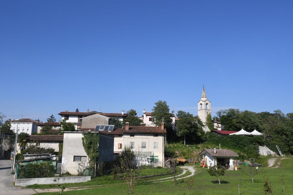 The village was very peaceful, and I do not recall seeing anyone at all during our visit there. The most noticeable buildings were the Italian church and across the border on a hill a Slovenian castle illustrating a historical defensive position.