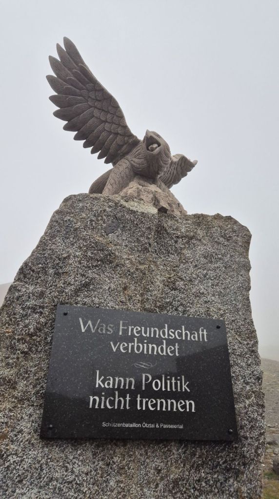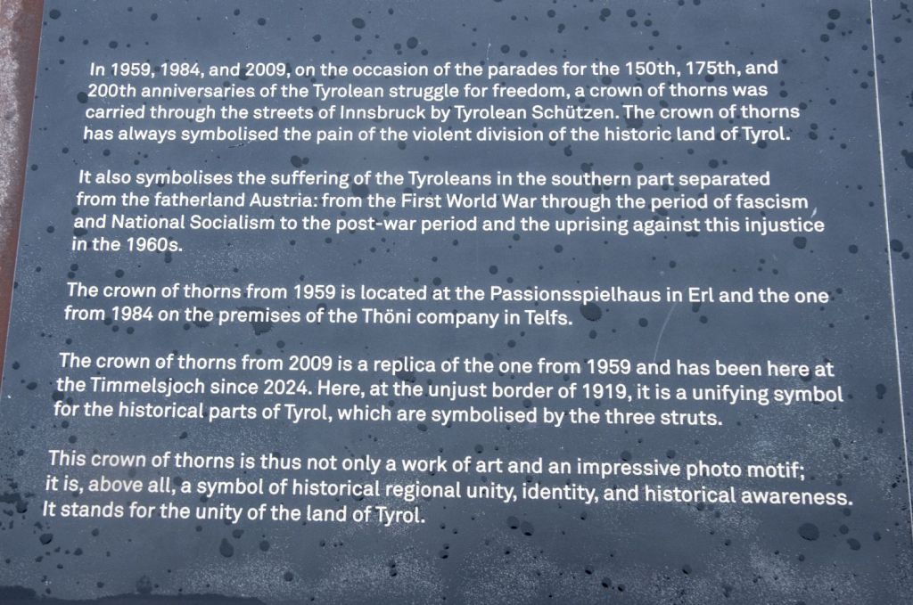 Above the road is a Crown of Thorns erected in September 2024, it serves as a memorial to the division of the Tyrol. The Crown of Thorns is also meant to unite and reflect historical Tyrol. The monument is associated with the Südtiroler Schützenbund a traditional hunting association that promotes the cultural identity of German speakers in the region. These hunting groups tend to be nationalistic and right wing.