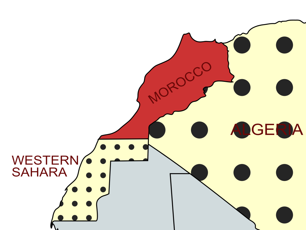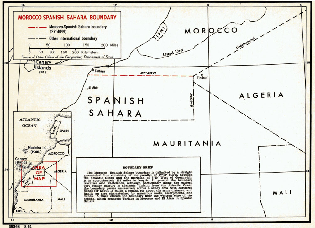 The border starts in the west at the Atlantic coast and consists of a single horizontal line, terminating in the east at the Algerian tripoint. The border traverses a thinly populated section of the Sahara desert. Once again the problems within the region stem from colonial occupation of Africa. The Western Sahara emerged from Spanish colonial rule. The current border between the 2 countries was established in 1904 between the Draa River and the Saguia el-Hamra border at 27°40’N. In 1958, two years after the rest of Morocco gained independence, the Spanish gave back the Tarfaya strip, but they kept the Spanish Sahara until November 1975.