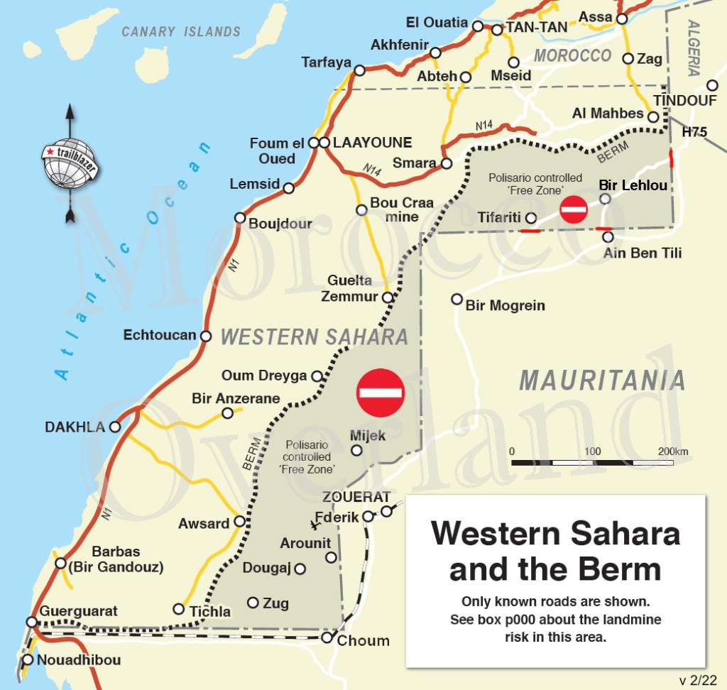This area is hugely contested and most of the area is occupied by Morocco who have created a system of earthworks called Berm’s which divide their areas from those areas controlled by Polisario and form an effective Line of Control (LOC), a 2,700 km-long sand wall or running south to north through Western Sahara and the southwestern portion of Morocco, it also encroaches into Mauritania. These areas are highly militarised, have uncharted minefields and are simply off limits for the average traveller. Visiting this border and tripoint is likely to be off limits for some time.