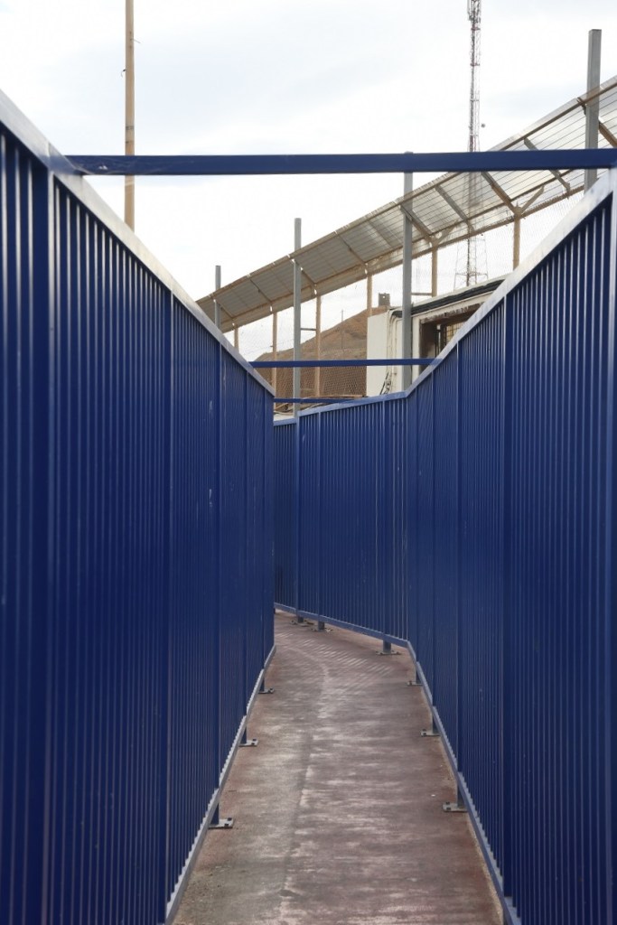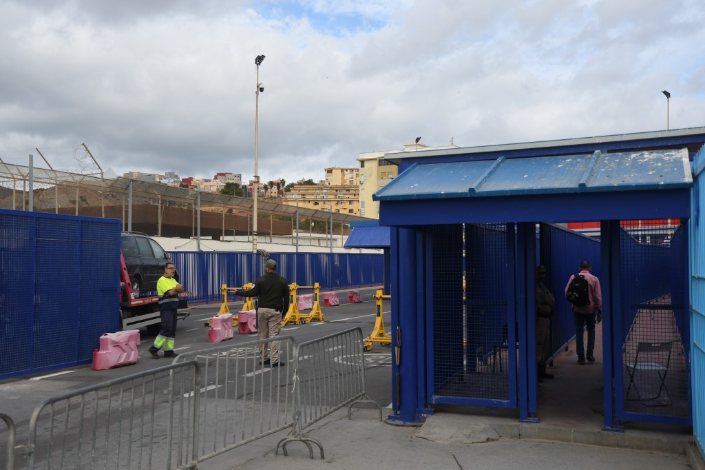 After leaving the long walkway we are at the border, the blue gates are Spain. On the left (not really visible) is a broken down car which is being swapped from a Moroccan recovery vehicle to a Spanish one right on the border. Note the line in the road as the surface changes at the border.
