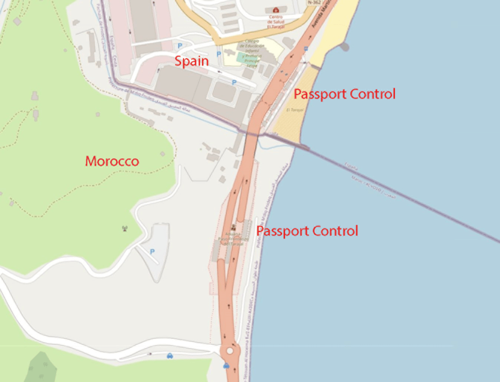 In reality the border crossing was really straightforward with thorough but quick checks on both sides. The border crossing is both for pedestrians and vehicles, with the former being separated into long tunnels that lead you from one side to the other. As a UK passport holder I was stamped out of Morocco and into the EU. A process that was repeated when I returned to Morocco later in the day. I visited this point as part of the IBRG SPEGEX-22 trip.