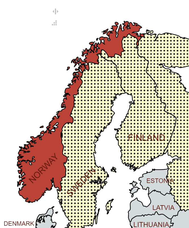Norway – Finland Border is 736km long. It is a land and river border between two tripoints. The western tripoint FINOSE is marked by Treriksröset, a stone cairn where both countries border Sweden.