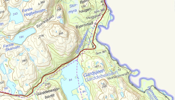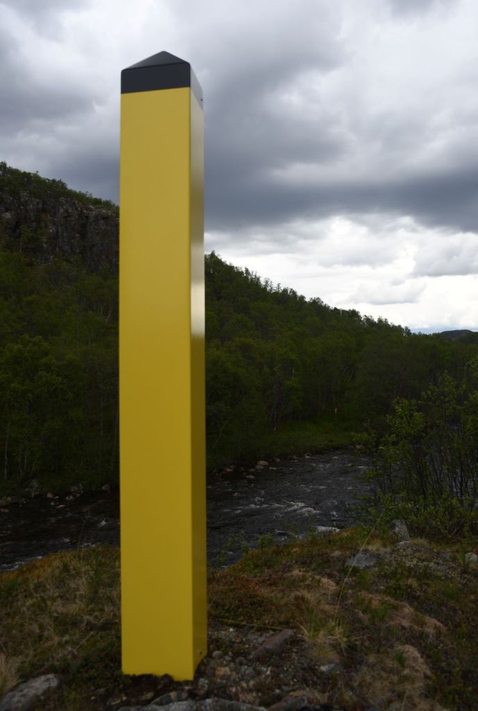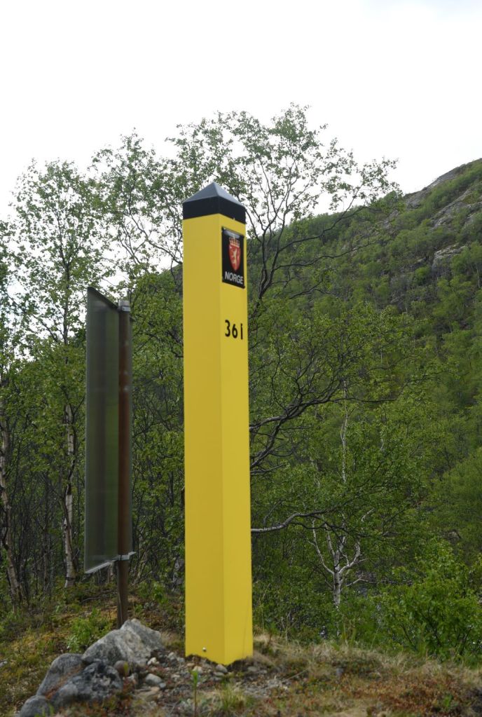 Travelling north on road 8860 it is not long before we reach the Jakobselva (Jacobs River) which is the border between Norway and Russia. The river runs along the border of Sør-Varanger Municipality in Finnmark county, Norway, and Pechengsky District in Murmansk Oblast, Russia. The land on the Russian side of the border is part of a border zone with restricted access. The Norwegian markers are yellow with a 18 centimetres tall black top—this was chosen because it would be most visible in all types of weather and lighting. The Russian markers have a pattern of alternating red (19cm wide) and green (17cm wide) bands. The red was chosen to symbolize the Flag of the Soviet Union, while the green symbolized the colour of the border guards’ uniforms. Both poles have the respective country’s coat of arms on the side facing the border. While originally made of wood, the border markers are now made of composite materials. Whereas on land border markers are 4m apart, on this river it is dependent on the terrain. The border is NOT the middle of the river, but is at the deepest point.