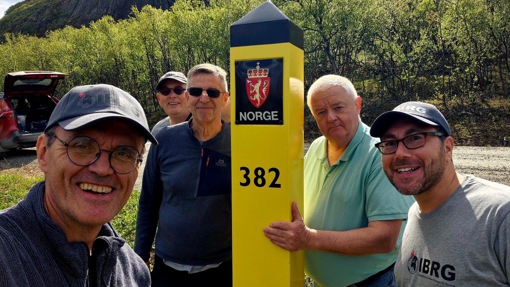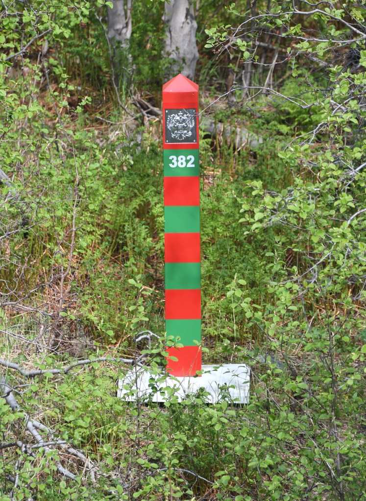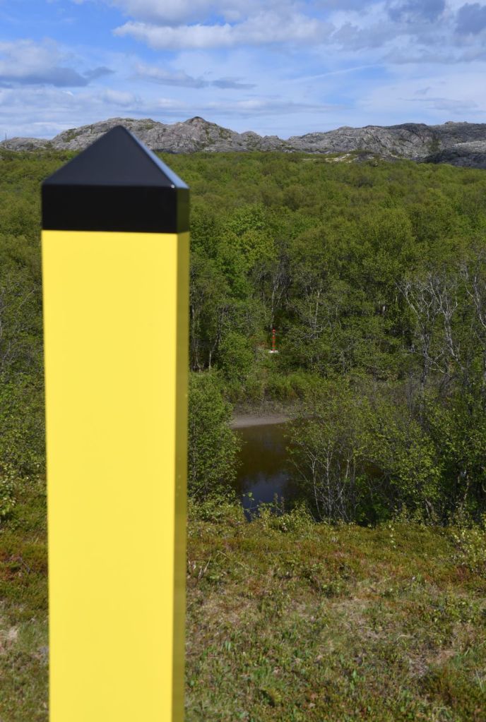 Travelling north on road 8860 it is not long before we reach the Jakobselva (Jacobs River) which is the border between Norway and Russia. The river runs along the border of Sør-Varanger Municipality in Finnmark county, Norway, and Pechengsky District in Murmansk Oblast, Russia. The land on the Russian side of the border is part of a border zone with restricted access. The Norwegian markers are yellow with a 18 centimetres tall black top—this was chosen because it would be most visible in all types of weather and lighting. The Russian markers have a pattern of alternating red (19cm wide) and green (17cm wide) bands. The red was chosen to symbolize the Flag of the Soviet Union, while the green symbolized the colour of the border guards’ uniforms. Both poles have the respective country’s coat of arms on the side facing the border. While originally made of wood, the border markers are now made of composite materials. Whereas on land border markers are 4m apart, on this river it is dependent on the terrain. The border is NOT the middle of the river, but is at the deepest point.