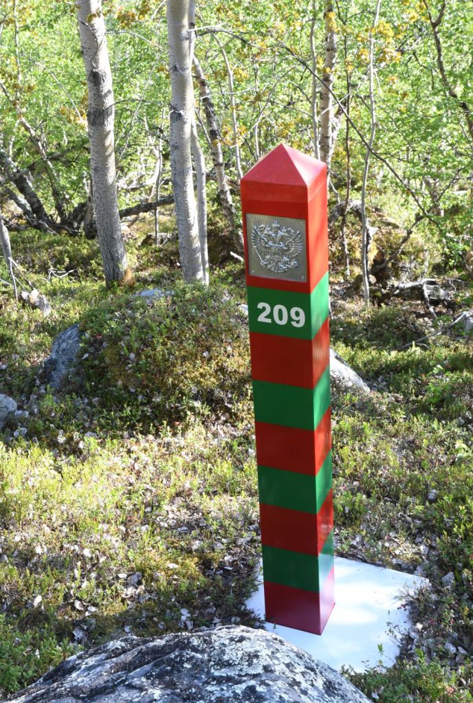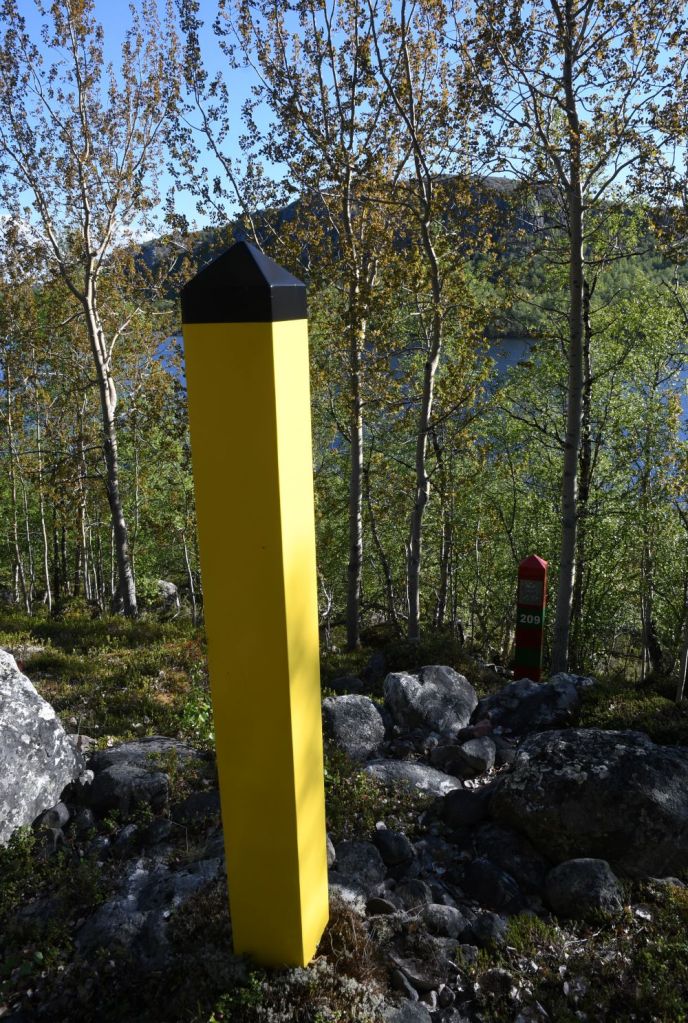 After navigating slowly up to the building and then steeply down the other side we finally reached the border marker #210. The Norwegian-Russian border is marked with 396 border markers. These include concrete pedestals, cairns, posts and leading marks. The border posts are set up in pairs across from each other. The Norwegian posts are yellow with black tops, while the Russian posts are red and green striped. On land, the border posts in a pair are 4 (four) meters apart in a cleared border corridor that is 8 (eight) meters wide, and the border line is located midway between the posts.