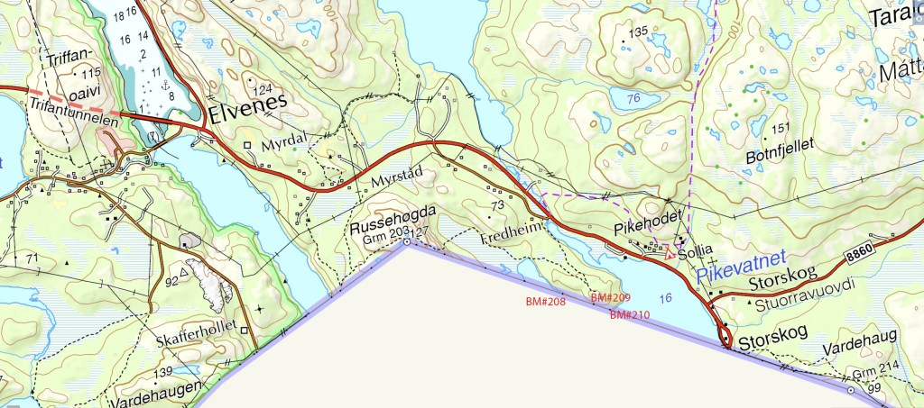 The planning phase for any border expedition raises area of possible exploration and also poses questions about access, feasibility and what we are likely to find. In this instance it appeared as if there was a small Russian pene enclave at the southern portion of the Pikeneset peninsula. Closer examination found that the border was delineated with 3 border markers BM #208 to BM#210 (west to east) and that there appeared to be a strip either side of the border markers. A small track led from the E105 to a Norwegian border observation post. The border was only a short distance from there. I visited this point as part of the IBRG ARTEX-24 expedition.