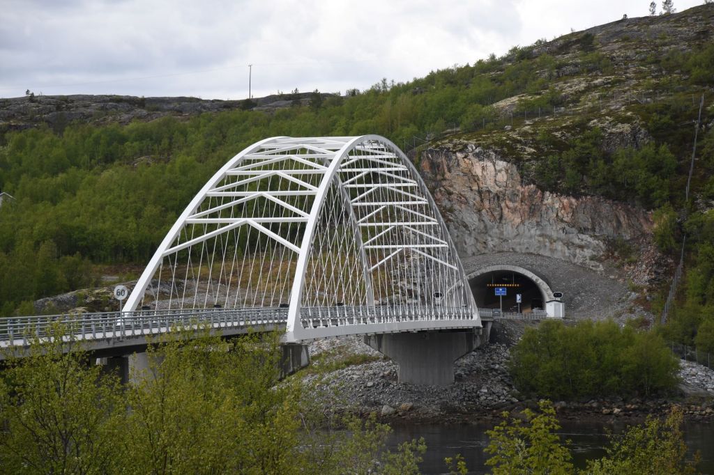 The Bøkfjord Bridge (Cost NOK 875 million/ EUR 90 million) across the Pasvik River is 284 meters long, it’s arch is 120m. Built in Germany and towed north along the coast of Norway the bridge was lifted into position by cranes. It removes the need to use the old narrow Elvenes Bridge and its adjacent residential area. Opened for traffic on 28 September 2017, it was inaugurated by the minister of transport Ketil Solvik-Olsen (Norway) and vice minister of transport Sergey Aristov (Russia), religious leaders from both countries blessed the bridge.