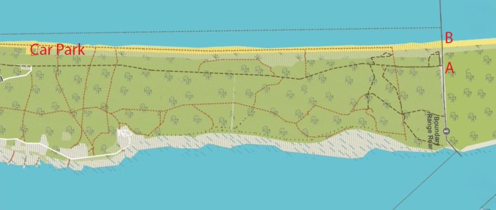 Driving along the Spit as far as possible to reach a car park, where there are many families picnicking, cycling and enjoying the sunny weather. The map below indicates the woodland tracks that lead to the buffer zone.