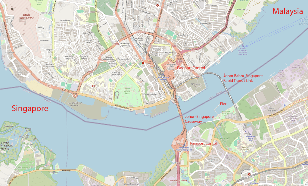 The distance between Singapore’s Woodlands Checkpoint and Malaysia’s Bangunan Sultan Iskandar is approximately 2.4 km. The causeway also serves as a water pipeline between the two countries. It is one of the busiest border crossings in the world, with 350,000 travellers daily. Many Malaysians continue to live in Malaysia and commute daily (with either public or private transportation) to Singapore, enduring extremely long journey times with extreme heavy traffic congestion on weekdays. The border is handled by immigration authorities of both countries at the Southern Integrated Gateway (Malaysia) and Woodlands Checkpoint (Singapore).