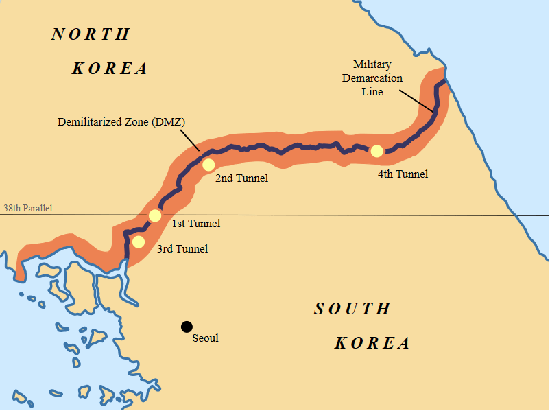 The Korean Demilitarized Zone (Korean: 한반도 비무장 지대) is a heavily militarized strip of land running across the Korean Peninsula near the 38th parallel north. The demilitarized zone (DMZ) is a border barrier that divides the peninsula roughly in half. It was established to serve as a buffer zone between the countries of North Korea and South Korea under the provisions of the Korean Armistice Agreement in 1953, an agreement between North Korea, China, and the United Nations Command.