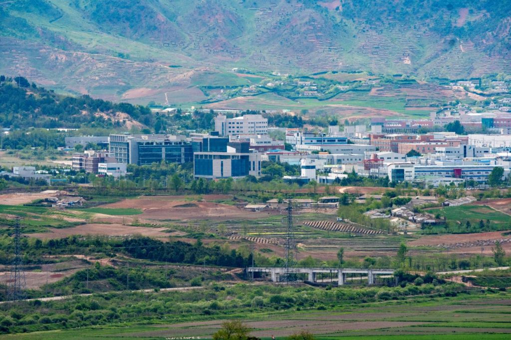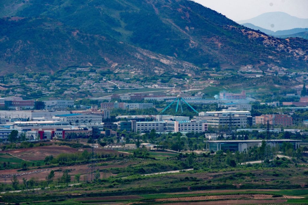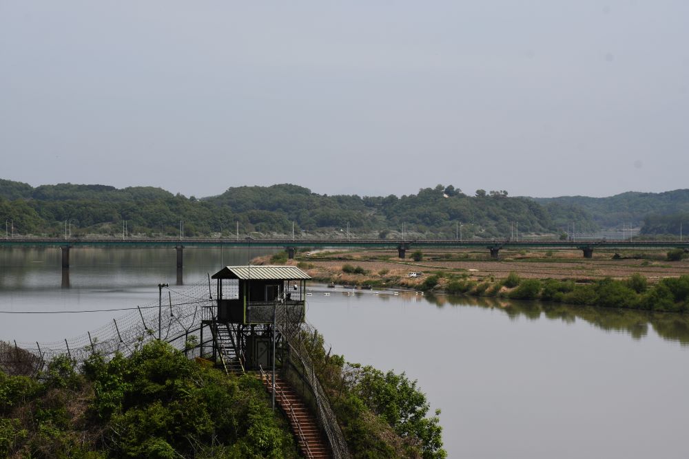 The watchtower in the foreground is the last South Korean watchtower before the border. The dark green line at the same level of the tower marks the northern bank of the river which marks the border. In the background is the city of Kaesong.