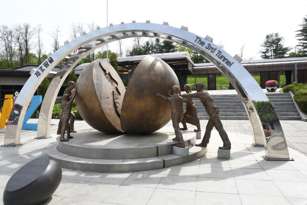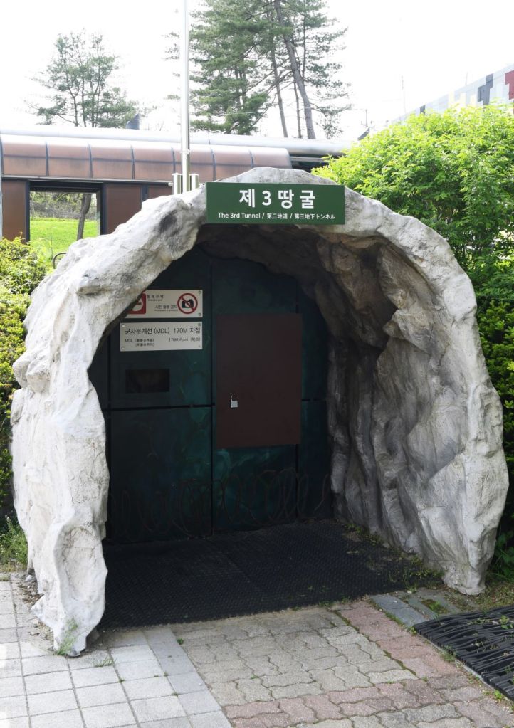 The incomplete tunnel was discovered in October 1978. The incomplete tunnel is 1,635 metres long, 1.95 m at its maximum height and 2.1 m wide. It runs through bedrock at a depth of about 73 m below ground. It was apparently designed for a surprise attack on Seoul from North Korea, and could, according to visitor information in the tunnel, accommodate 30,000 men per hour along with light weaponry. The tunnel is now a tourist attraction and the area around its entrance has several sculptures. It is not possible to take any photos in the tunnel and cameras need to be deposited in lockers at the entrance. Visitors enter either by walking down a long steep incline that starts in a lobby with a gift shop or via a rubber-tyred train that contains a driver at the front or the back (depending on the direction as there is only one set of rails) and padded seats facing forward and backwards in rows for up to three passengers each. The South Koreans have blocked the actual Military Demarcation Line in the tunnel with three concrete barricades. Tourists can walk as far as the third barricade, and the second barricade is visible through a small window in the third. There are many model displays of the tunnel and other areas of the DMZ.